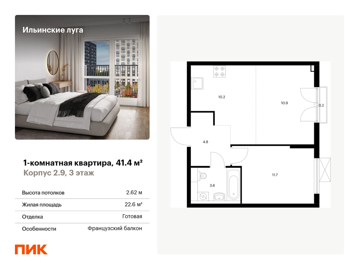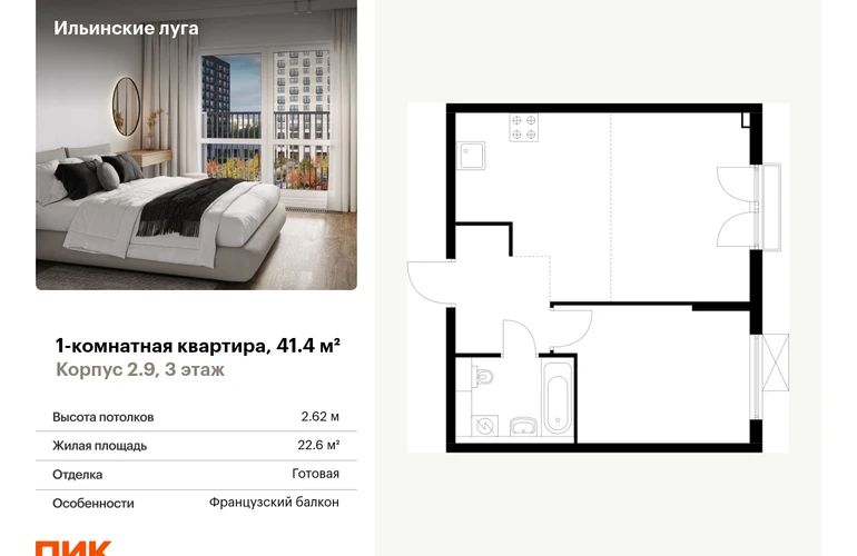 Продаётся 1-комн.квартира площадью 41.40 кв.м на 3 этаже 9 этажного дома (Корпус 2.9, секция 3) проекта ПИК Ильинские луга. Светлый просторный подъезд на уровне земли, функциональная планировка, большие окна, с отделкой. <br> <br>Жилой район «Ильинские луга» находится в 10 километрах от МКАД по Новорижскому шоссе, в 20 минутах на автомобиле от станций метро «Волоколамская», «Тушинская» и «Строгино». В будущем ближе к проекту, в 9 минутах пути на машине, откроется станция «Ильинская» Рублёво-Архангельской линии, которая будет соединять Арбатско-Покровскую линию и Большую кольцевую линию. <br> <br>«Ильинские луга» — масштабный проект, в который входит девять детских садов, четыре школы и поликлиника. Он строится в престижном и экологичном районе среди лесов и памятников природы. За 5 минут от жилого квартала можно доехать до Рублёво-Успенского шоссе, а за 30 минут — до центра Москвы. До крупного торгового центра «РИГАМОЛЛ» всего 5 минут на автомобиле, а до ТЦ «Твой дом» и гипермаркета «Глобус» — 10 минут. <br> <br>В «Ильинских лугах» строятся только девятиэтажные дома — такая архитектура соответствует спокойной жизни за городом. В каждом дворе-парке есть места для отдыха, детские и спортивные площадки. А ещё, здесь уже открыт большой PlayHub «Гравити» — современное игровое пространство с космической тематикой, холмами, зонами для игр и отдыха жителей любого возраста. <br> <br>На первых этажах уже работают магазины, кафе и пекарни. <br> <br>Места для отдыха от «Ильинских лугов» тоже недалеко: 10 минут на машине — и вы в музее-усадьбе «Архангельское». Также рядом находится Лохин остров — памятник природы, где водятся речные черепахи, есть места для кемпинга и возможность сплавиться по реке. Артикул - 933865О застройщике
