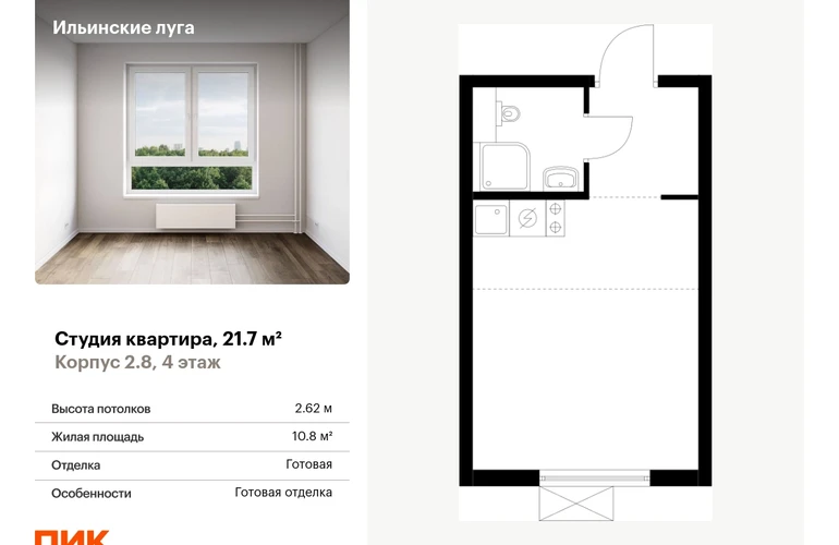 Продаётся квартира-студия площадью 21.70 кв.м на 4 этаже 9 этажного дома (Корпус 2.8, секция 6) проекта ПИК Ильинские луга. Светлый просторный подъезд на уровне земли, функциональная планировка, большие окна, с отделкой. <br> <br>Жилой район «Ильинские луга» находится в 10 километрах от МКАД по Новорижскому шоссе, в 20 минутах на автомобиле от станций метро «Волоколамская», «Тушинская» и «Строгино». В будущем ближе к проекту, в 9 минутах пути на машине, откроется станция «Ильинская» Рублёво-Архангельской линии, которая будет соединять Арбатско-Покровскую линию и Большую кольцевую линию. <br> <br>«Ильинские луга» — масштабный проект, в который входит девять детских садов, четыре школы и поликлиника. Он строится в престижном и экологичном районе среди лесов и памятников природы. За 5 минут от жилого квартала можно доехать до Рублёво-Успенского шоссе, а за 30 минут — до центра Москвы. До крупного торгового центра «РИГАМОЛЛ» всего 5 минут на автомобиле, а до ТЦ «Твой дом» и гипермаркета «Глобус» — 10 минут. <br> <br>В «Ильинских лугах» строятся только девятиэтажные дома — такая архитектура соответствует спокойной жизни за городом. В каждом дворе-парке есть места для отдыха, детские и спортивные площадки. А ещё, здесь уже открыт большой PlayHub «Гравити» — современное игровое пространство с космической тематикой, холмами, зонами для игр и отдыха жителей любого возраста. <br> <br>На первых этажах уже работают магазины, кафе и пекарни. <br> <br>Места для отдыха от «Ильинских лугов» тоже недалеко: 10 минут на машине — и вы в музее-усадьбе «Архангельское». Также рядом находится Лохин остров — памятник природы, где водятся речные черепахи, есть места для кемпинга и возможность сплавиться по реке. Артикул - 942993О застройщике