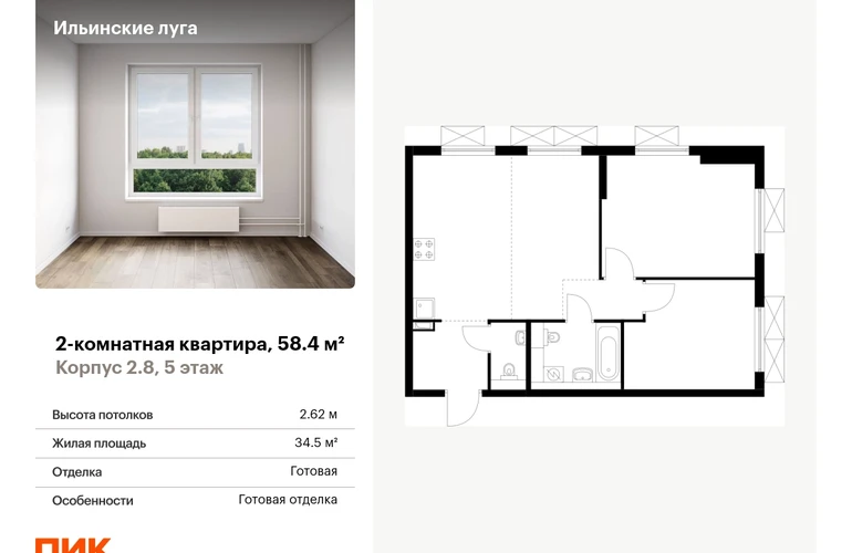 Продаётся 2-комн.квартира площадью 58.40 кв.м на 5 этаже 9 этажного дома (Корпус 2.8, секция 3) проекта ПИК Ильинские луга. Светлый просторный подъезд на уровне земли, функциональная планировка, большие окна, с отделкой. <br> <br>Жилой район «Ильинские луга» находится в 10 километрах от МКАД по Новорижскому шоссе, в 20 минутах на автомобиле от станций метро «Волоколамская», «Тушинская» и «Строгино». В будущем ближе к проекту, в 9 минутах пути на машине, откроется станция «Ильинская» Рублёво-Архангельской линии, которая будет соединять Арбатско-Покровскую линию и Большую кольцевую линию. <br> <br>«Ильинские луга» — масштабный проект, в который входит девять детских садов, четыре школы и поликлиника. Он строится в престижном и экологичном районе среди лесов и памятников природы. За 5 минут от жилого квартала можно доехать до Рублёво-Успенского шоссе, а за 30 минут — до центра Москвы. До крупного торгового центра «РИГАМОЛЛ» всего 5 минут на автомобиле, а до ТЦ «Твой дом» и гипермаркета «Глобус» — 10 минут. <br> <br>В «Ильинских лугах» строятся только девятиэтажные дома — такая архитектура соответствует спокойной жизни за городом. В каждом дворе-парке есть места для отдыха, детские и спортивные площадки. А ещё, здесь уже открыт большой PlayHub «Гравити» — современное игровое пространство с космической тематикой, холмами, зонами для игр и отдыха жителей любого возраста. <br> <br>На первых этажах уже работают магазины, кафе и пекарни. <br> <br>Места для отдыха от «Ильинских лугов» тоже недалеко: 10 минут на машине — и вы в музее-усадьбе «Архангельское». Также рядом находится Лохин остров — памятник природы, где водятся речные черепахи, есть места для кемпинга и возможность сплавиться по реке. Артикул - 942722О застройщике
