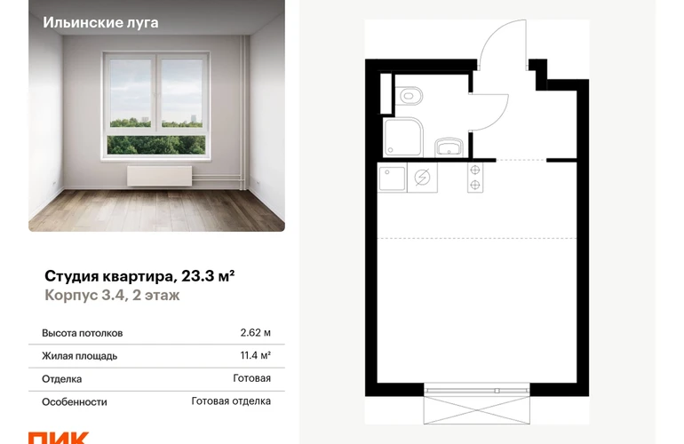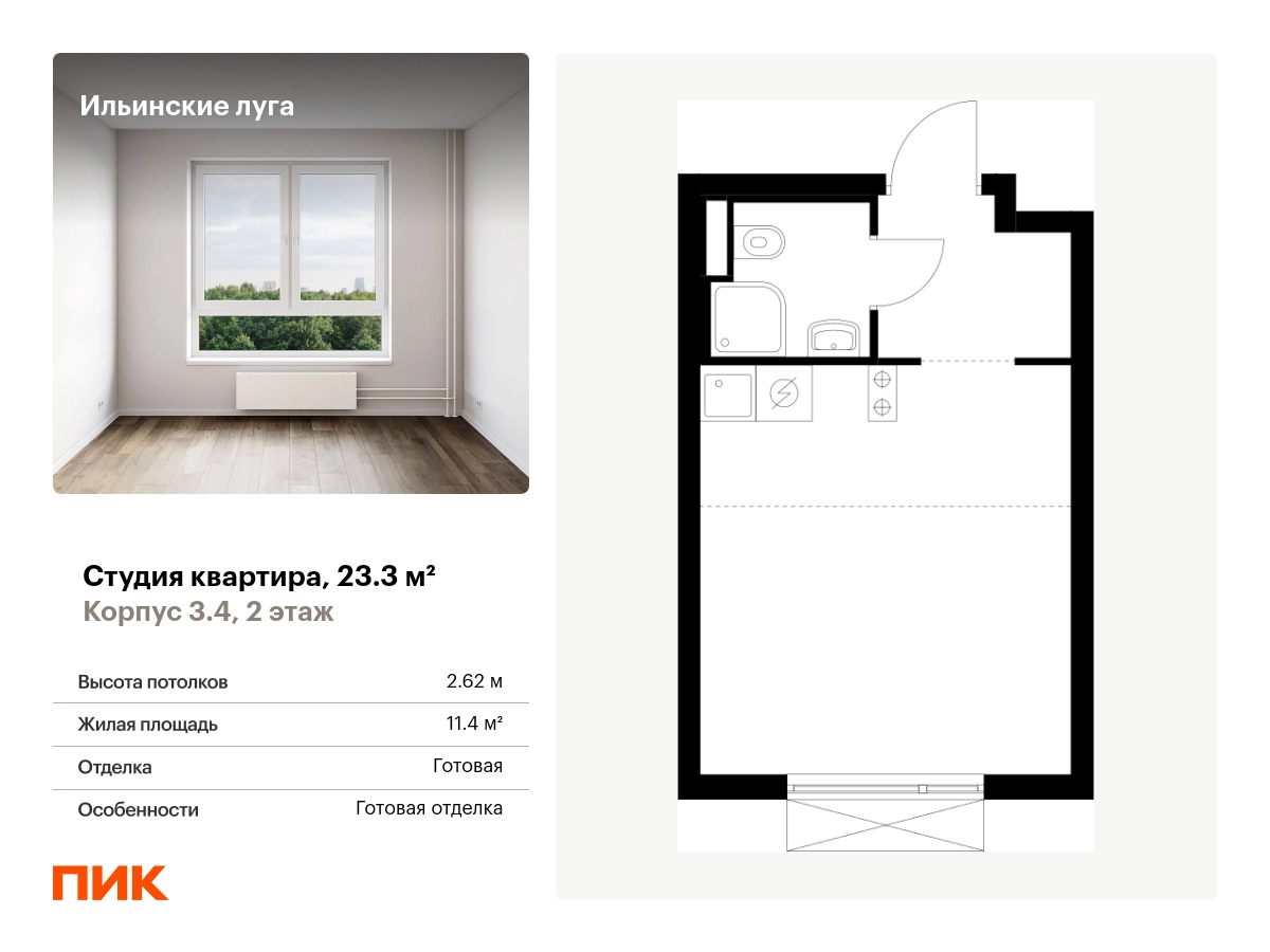 Продаётся квартира-студия площадью 23.30 кв.м на 2 этаже 9 этажного дома (Корпус 3.4, секция 1) проекта ПИК Ильинские луга. Светлый просторный подъезд на уровне земли, функциональная планировка, большие окна, с отделкой. Жилой район «Ильинские луга» находится в 10 километрах от МКАД по Новорижскому шоссе, в 20 минутах на автомобиле от станций метро «Волоколамская», «Тушинская» и «Строгино». В будущем ближе к проекту, в 9 минутах пути на машине, откроется станция «Ильинская» Рублёво-Архангельской линии, которая будет соединять Арбатско-Покровскую линию и Большую кольцевую линию. «Ильинские луга» — масштабный проект, в который входит девять детских садов, четыре школы и поликлиника. Он строится в престижном и экологичном районе среди лесов и памятников природы. За 5 минут от жилого квартала можно доехать до Рублёво-Успенского шоссе, а за 30 минут — до центра Москвы. До крупного торгового центра «РИГАМОЛЛ» всего 5 минут на автомобиле, а до ТЦ «Твой дом» и гипермаркета «Глобус» — 10 минут. В «Ильинских лугах» строятся только девятиэтажные дома — такая архитектура соответствует спокойной жизни за городом. В каждом дворе-парке есть места для отдыха, детские и спортивные площадки. А ещё, здесь уже открыт большой PlayHub «Гравити» — современное игровое пространство с космической тематикой, холмами, зонами для игр и отдыха жителей любого возраста. На первых этажах уже работают магазины, кафе и пекарни. Места для отдыха от «Ильинских лугов» тоже недалеко: 10 минут на машине — и вы в музее-усадьбе «Архангельское». Также рядом находится Лохин остров — памятник природы, где водятся речные черепахи, есть места для кемпинга и возможность сплавиться по реке. Артикул - 995396О застройщике