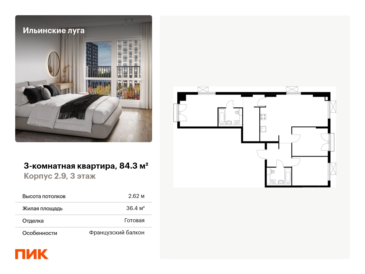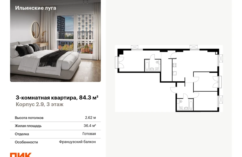 Продаётся 3-комн.квартира площадью 84.30 кв.м на 3 этаже 9 этажного дома (Корпус 2.9, секция 5) проекта ПИК Ильинские луга. Светлый просторный подъезд на уровне земли, функциональная планировка, большие окна, с отделкой. Жилой район «Ильинские луга» находится в 10 километрах от МКАД по Новорижскому шоссе, в 20 минутах на автомобиле от станций метро «Волоколамская», «Тушинская» и «Строгино». В будущем ближе к проекту, в 9 минутах пути на машине, откроется станция «Ильинская» Рублёво-Архангельской линии, которая будет соединять Арбатско-Покровскую линию и Большую кольцевую линию. «Ильинские луга» — масштабный проект, в который входит девять детских садов, четыре школы и поликлиника. Он строится в престижном и экологичном районе среди лесов и памятников природы. За 5 минут от жилого квартала можно доехать до Рублёво-Успенского шоссе, а за 30 минут — до центра Москвы. До крупного торгового центра «РИГАМОЛЛ» всего 5 минут на автомобиле, а до ТЦ «Твой дом» и гипермаркета «Глобус» — 10 минут. В «Ильинских лугах» строятся только девятиэтажные дома — такая архитектура соответствует спокойной жизни за городом. В каждом дворе-парке есть места для отдыха, детские и спортивные площадки. А ещё, здесь уже открыт большой PlayHub «Гравити» — современное игровое пространство с космической тематикой, холмами, зонами для игр и отдыха жителей любого возраста. На первых этажах уже работают магазины, кафе и пекарни. Места для отдыха от «Ильинских лугов» тоже недалеко: 10 минут на машине — и вы в музее-усадьбе «Архангельское». Также рядом находится Лохин остров — памятник природы, где водятся речные черепахи, есть места для кемпинга и возможность сплавиться по реке. Артикул - 936015О застройщике