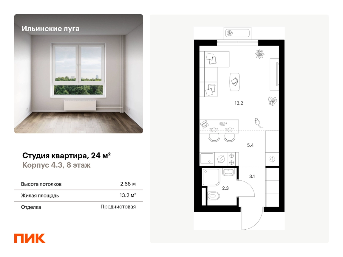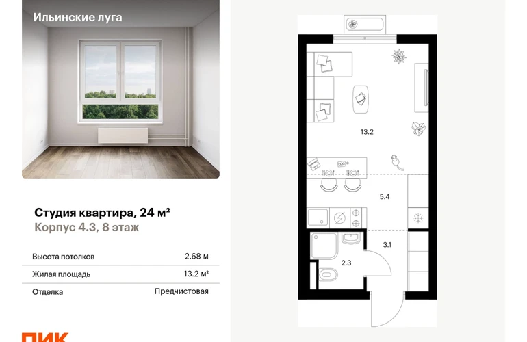 Продаётся квартира-студия площадью 24.00 кв.м на 8 этаже 9 этажного дома (Корпус 4.3, секция 1) проекта ПИК Ильинские луга. Светлый просторный подъезд на уровне земли, функциональная планировка, большие окна, с отделкой. Жилой район «Ильинские луга» находится в 10 километрах от МКАД по Новорижскому шоссе, в 20 минутах на автомобиле от станций метро «Волоколамская», «Тушинская» и «Строгино». В будущем ближе к проекту, в 9 минутах пути на машине, откроется станция «Ильинская» Рублёво-Архангельской линии, которая будет соединять Арбатско-Покровскую линию и Большую кольцевую линию. «Ильинские луга» — масштабный проект, в который входит девять детских садов, четыре школы и поликлиника. Он строится в престижном и экологичном районе среди лесов и памятников природы. За 5 минут от жилого квартала можно доехать до Рублёво-Успенского шоссе, а за 30 минут — до центра Москвы. До крупного торгового центра «РИГАМОЛЛ» всего 5 минут на автомобиле, а до ТЦ «Твой дом» и гипермаркета «Глобус» — 10 минут. В «Ильинских лугах» строятся только девятиэтажные дома — такая архитектура соответствует спокойной жизни за городом. В каждом дворе-парке есть места для отдыха, детские и спортивные площадки. А ещё, здесь уже открыт большой PlayHub «Гравити» — современное игровое пространство с космической тематикой, холмами, зонами для игр и отдыха жителей любого возраста. На первых этажах уже работают магазины, кафе и пекарни. Места для отдыха от «Ильинских лугов» тоже недалеко: 10 минут на машине — и вы в музее-усадьбе «Архангельское». Также рядом находится Лохин остров — памятник природы, где водятся речные черепахи, есть места для кемпинга и возможность сплавиться по реке. Артикул - 1011836О застройщике