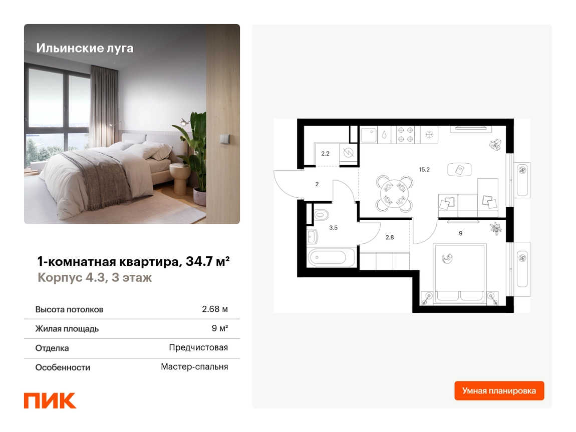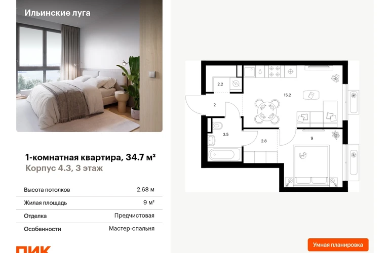 Продаётся 1-комн.квартира площадью 34.70 кв.м на 3 этаже 9 этажного дома (Корпус 4.3, секция 4) проекта ПИК Ильинские луга. Светлый просторный подъезд на уровне земли, функциональная планировка, большие окна, с отделкой. Жилой район «Ильинские луга» находится в 10 километрах от МКАД по Новорижскому шоссе, в 20 минутах на автомобиле от станций метро «Волоколамская», «Тушинская» и «Строгино». В будущем ближе к проекту, в 9 минутах пути на машине, откроется станция «Ильинская» Рублёво-Архангельской линии, которая будет соединять Арбатско-Покровскую линию и Большую кольцевую линию. «Ильинские луга» — масштабный проект, в который входит девять детских садов, четыре школы и поликлиника. Он строится в престижном и экологичном районе среди лесов и памятников природы. За 5 минут от жилого квартала можно доехать до Рублёво-Успенского шоссе, а за 30 минут — до центра Москвы. До крупного торгового центра «РИГАМОЛЛ» всего 5 минут на автомобиле, а до ТЦ «Твой дом» и гипермаркета «Глобус» — 10 минут. В «Ильинских лугах» строятся только девятиэтажные дома — такая архитектура соответствует спокойной жизни за городом. В каждом дворе-парке есть места для отдыха, детские и спортивные площадки. А ещё, здесь уже открыт большой PlayHub «Гравити» — современное игровое пространство с космической тематикой, холмами, зонами для игр и отдыха жителей любого возраста. На первых этажах уже работают магазины, кафе и пекарни. Места для отдыха от «Ильинских лугов» тоже недалеко: 10 минут на машине — и вы в музее-усадьбе «Архангельское». Также рядом находится Лохин остров — памятник природы, где водятся речные черепахи, есть места для кемпинга и возможность сплавиться по реке. Артикул - 1012116О застройщике