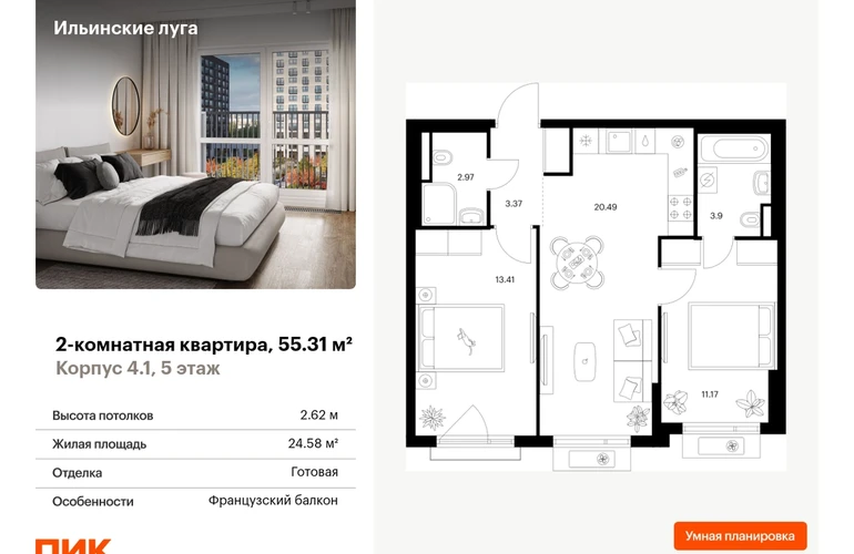 Продаётся 2-комн.квартира площадью 55.31 кв.м на 5 этаже 9 этажного дома (Корпус 4.1, секция 4) проекта ПИК Ильинские луга. Светлый просторный подъезд на уровне земли, функциональная планировка, большие окна, с отделкой. Жилой район «Ильинские луга» находится в 10 километрах от МКАД по Новорижскому шоссе, в 20 минутах на автомобиле от станций метро «Волоколамская», «Тушинская» и «Строгино». В будущем ближе к проекту, в 9 минутах пути на машине, откроется станция «Ильинская» Рублёво-Архангельской линии, которая будет соединять Арбатско-Покровскую линию и Большую кольцевую линию. «Ильинские луга» — масштабный проект, в который входит девять детских садов, четыре школы и поликлиника. Он строится в престижном и экологичном районе среди лесов и памятников природы. За 5 минут от жилого квартала можно доехать до Рублёво-Успенского шоссе, а за 30 минут — до центра Москвы. До крупного торгового центра «РИГАМОЛЛ» всего 5 минут на автомобиле, а до ТЦ «Твой дом» и гипермаркета «Глобус» — 10 минут. В «Ильинских лугах» строятся только девятиэтажные дома — такая архитектура соответствует спокойной жизни за городом. В каждом дворе-парке есть места для отдыха, детские и спортивные площадки. А ещё, здесь уже открыт большой PlayHub «Гравити» — современное игровое пространство с космической тематикой, холмами, зонами для игр и отдыха жителей любого возраста. На первых этажах уже работают магазины, кафе и пекарни. Места для отдыха от «Ильинских лугов» тоже недалеко: 10 минут на машине — и вы в музее-усадьбе «Архангельское». Также рядом находится Лохин остров — памятник природы, где водятся речные черепахи, есть места для кемпинга и возможность сплавиться по реке. Артикул - 1016067О застройщике