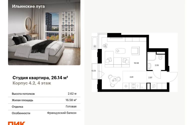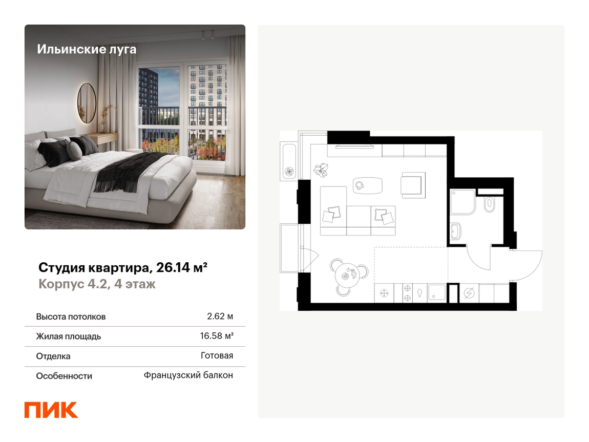 Продаётся квартира-студия площадью 26.14 кв.м на 4 этаже 9 этажного дома (Корпус 4.2, секция 1) проекта ПИК Ильинские луга. Светлый просторный подъезд на уровне земли, функциональная планировка, большие окна, с отделкой. Жилой район «Ильинские луга» находится в 10 километрах от МКАД по Новорижскому шоссе, в 20 минутах на автомобиле от станций метро «Волоколамская», «Тушинская» и «Строгино». В будущем ближе к проекту, в 9 минутах пути на машине, откроется станция «Ильинская» Рублёво-Архангельской линии, которая будет соединять Арбатско-Покровскую линию и Большую кольцевую линию. «Ильинские луга» — масштабный проект, в который входит девять детских садов, четыре школы и поликлиника. Он строится в престижном и экологичном районе среди лесов и памятников природы. За 5 минут от жилого квартала можно доехать до Рублёво-Успенского шоссе, а за 30 минут — до центра Москвы. До крупного торгового центра «РИГАМОЛЛ» всего 5 минут на автомобиле, а до ТЦ «Твой дом» и гипермаркета «Глобус» — 10 минут. В «Ильинских лугах» строятся только девятиэтажные дома — такая архитектура соответствует спокойной жизни за городом. В каждом дворе-парке есть места для отдыха, детские и спортивные площадки. А ещё, здесь уже открыт большой PlayHub «Гравити» — современное игровое пространство с космической тематикой, холмами, зонами для игр и отдыха жителей любого возраста. На первых этажах уже работают магазины, кафе и пекарни. Места для отдыха от «Ильинских лугов» тоже недалеко: 10 минут на машине — и вы в музее-усадьбе «Архангельское». Также рядом находится Лохин остров — памятник природы, где водятся речные черепахи, есть места для кемпинга и возможность сплавиться по реке. Артикул - 1015334О застройщике