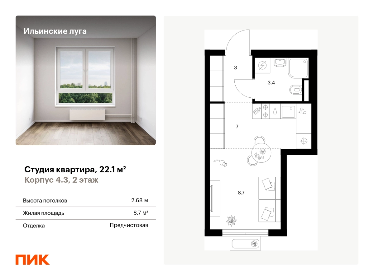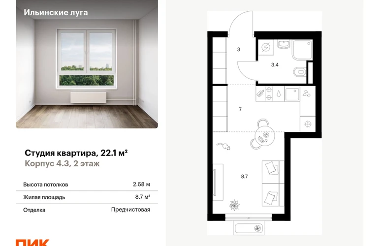 Продаётся квартира-студия площадью 22.10 кв.м на 2 этаже 9 этажного дома (Корпус 4.3, секция 3) проекта ПИК Ильинские луга. Светлый просторный подъезд на уровне земли, функциональная планировка, большие окна, с отделкой. <br> <br>Жилой район «Ильинские луга» находится в 10 километрах от МКАД по Новорижскому шоссе, в 20 минутах на автомобиле от станций метро «Волоколамская», «Тушинская» и «Строгино». В будущем ближе к проекту, в 9 минутах пути на машине, откроется станция «Ильинская» Рублёво-Архангельской линии, которая будет соединять Арбатско-Покровскую линию и Большую кольцевую линию. <br> <br>«Ильинские луга» — масштабный проект, в который входит девять детских садов, четыре школы и поликлиника. Он строится в престижном и экологичном районе среди лесов и памятников природы. За 5 минут от жилого квартала можно доехать до Рублёво-Успенского шоссе, а за 30 минут — до центра Москвы. До крупного торгового центра «РИГАМОЛЛ» всего 5 минут на автомобиле, а до ТЦ «Твой дом» и гипермаркета «Глобус» — 10 минут. <br> <br>В «Ильинских лугах» строятся только девятиэтажные дома — такая архитектура соответствует спокойной жизни за городом. В каждом дворе-парке есть места для отдыха, детские и спортивные площадки. А ещё, здесь уже открыт большой PlayHub «Гравити» — современное игровое пространство с космической тематикой, холмами, зонами для игр и отдыха жителей любого возраста. <br> <br>На первых этажах уже работают магазины, кафе и пекарни. <br> <br>Места для отдыха от «Ильинских лугов» тоже недалеко: 10 минут на машине — и вы в музее-усадьбе «Архангельское». Также рядом находится Лохин остров — памятник природы, где водятся речные черепахи, есть места для кемпинга и возможность сплавиться по реке. Артикул - 1012001О застройщике