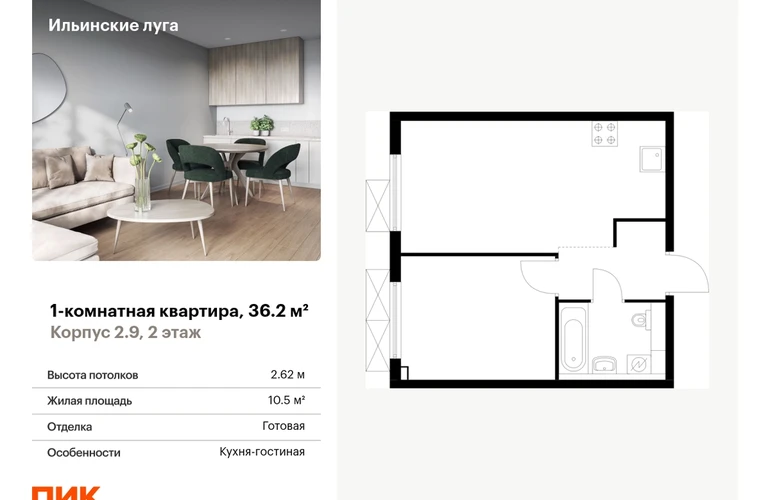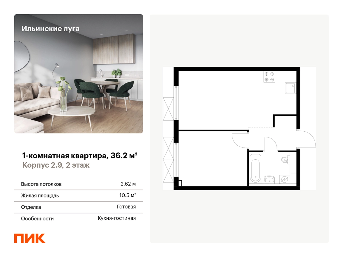 Продаётся 1-комн.квартира площадью 36.20 кв.м на 2 этаже 9 этажного дома (Корпус 2.9, секция 1) проекта ПИК Ильинские луга. Светлый просторный подъезд на уровне земли, функциональная планировка, большие окна, с отделкой. <br> <br>Жилой район «Ильинские луга» находится в 10 километрах от МКАД по Новорижскому шоссе, в 20 минутах на автомобиле от станций метро «Волоколамская», «Тушинская» и «Строгино». В будущем ближе к проекту, в 9 минутах пути на машине, откроется станция «Ильинская» Рублёво-Архангельской линии, которая будет соединять Арбатско-Покровскую линию и Большую кольцевую линию. <br> <br>«Ильинские луга» — масштабный проект, в который входит девять детских садов, четыре школы и поликлиника. Он строится в престижном и экологичном районе среди лесов и памятников природы. За 5 минут от жилого квартала можно доехать до Рублёво-Успенского шоссе, а за 30 минут — до центра Москвы. До крупного торгового центра «РИГАМОЛЛ» всего 5 минут на автомобиле, а до ТЦ «Твой дом» и гипермаркета «Глобус» — 10 минут. <br> <br>В «Ильинских лугах» строятся только девятиэтажные дома — такая архитектура соответствует спокойной жизни за городом. В каждом дворе-парке есть места для отдыха, детские и спортивные площадки. А ещё, здесь уже открыт большой PlayHub «Гравити» — современное игровое пространство с космической тематикой, холмами, зонами для игр и отдыха жителей любого возраста. <br> <br>На первых этажах уже работают магазины, кафе и пекарни. <br> <br>Места для отдыха от «Ильинских лугов» тоже недалеко: 10 минут на машине — и вы в музее-усадьбе «Архангельское». Также рядом находится Лохин остров — памятник природы, где водятся речные черепахи, есть места для кемпинга и возможность сплавиться по реке. Артикул - 933743О застройщике