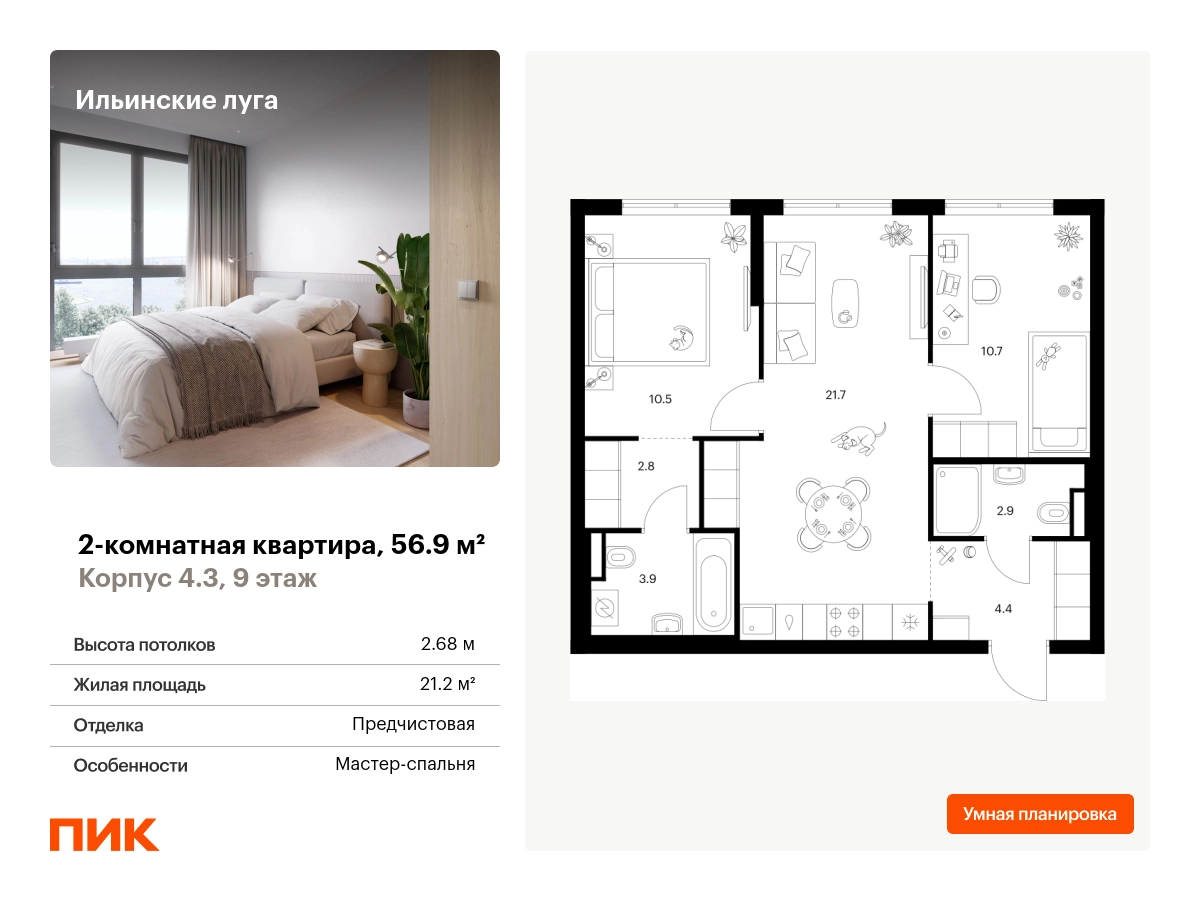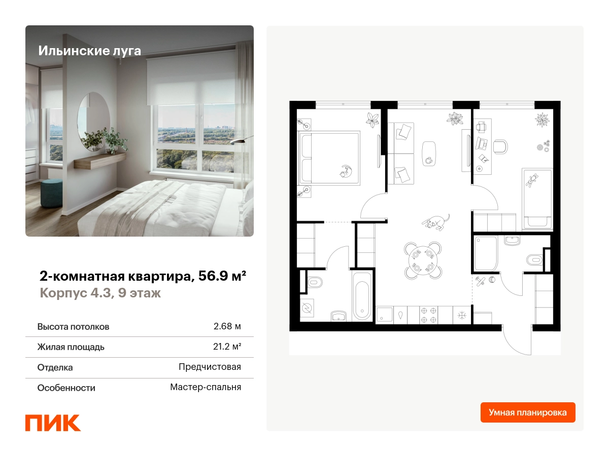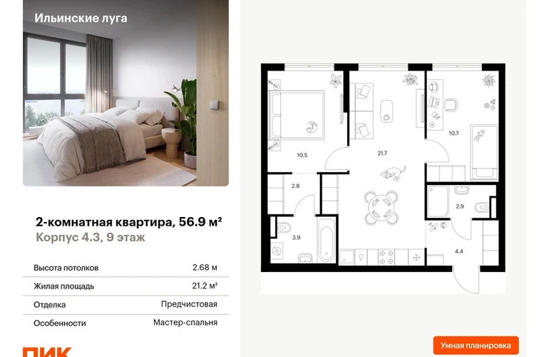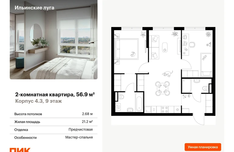 Продаётся 2-комн.квартира площадью 56.90 кв.м на 9 этаже 9 этажного дома (Корпус 4.3, секция 2) проекта ПИК Ильинские луга. Светлый просторный подъезд на уровне земли, функциональная планировка, большие окна, с отделкой. Жилой район «Ильинские луга» находится в 10 километрах от МКАД по Новорижскому шоссе, в 20 минутах на автомобиле от станций метро «Волоколамская», «Тушинская» и «Строгино». В будущем ближе к проекту, в 9 минутах пути на машине, откроется станция «Ильинская» Рублёво-Архангельской линии, которая будет соединять Арбатско-Покровскую линию и Большую кольцевую линию. «Ильинские луга» — масштабный проект, в который входит девять детских садов, четыре школы и поликлиника. Он строится в престижном и экологичном районе среди лесов и памятников природы. За 5 минут от жилого квартала можно доехать до Рублёво-Успенского шоссе, а за 30 минут — до центра Москвы. До крупного торгового центра «РИГАМОЛЛ» всего 5 минут на автомобиле, а до ТЦ «Твой дом» и гипермаркета «Глобус» — 10 минут. В «Ильинских лугах» строятся только девятиэтажные дома — такая архитектура соответствует спокойной жизни за городом. В каждом дворе-парке есть места для отдыха, детские и спортивные площадки. А ещё, здесь уже открыт большой PlayHub «Гравити» — современное игровое пространство с космической тематикой, холмами, зонами для игр и отдыха жителей любого возраста. На первых этажах уже работают магазины, кафе и пекарни. Места для отдыха от «Ильинских лугов» тоже недалеко: 10 минут на машине — и вы в музее-усадьбе «Архангельское». Также рядом находится Лохин остров — памятник природы, где водятся речные черепахи, есть места для кемпинга и возможность сплавиться по реке. Артикул - 1011979О застройщике
