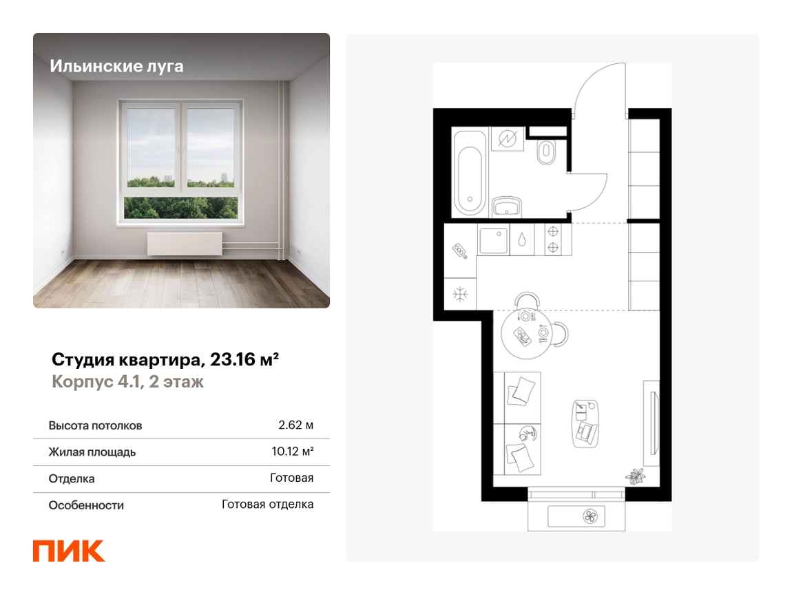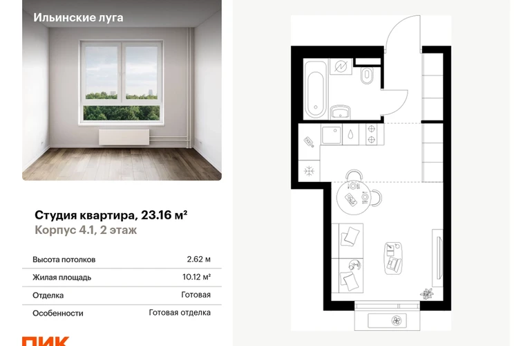 Продаётся квартира-студия площадью 23.16 кв.м на 2 этаже 9 этажного дома (Корпус 4.1, секция 2) проекта ПИК Ильинские луга. Светлый просторный подъезд на уровне земли, функциональная планировка, большие окна, с отделкой. <br> <br>Жилой район «Ильинские луга» находится в 10 километрах от МКАД по Новорижскому шоссе, в 20 минутах на автомобиле от станций метро «Волоколамская», «Тушинская» и «Строгино». В будущем ближе к проекту, в 9 минутах пути на машине, откроется станция «Ильинская» Рублёво-Архангельской линии, которая будет соединять Арбатско-Покровскую линию и Большую кольцевую линию. <br> <br>«Ильинские луга» — масштабный проект, в который входит девять детских садов, четыре школы и поликлиника. Он строится в престижном и экологичном районе среди лесов и памятников природы. За 5 минут от жилого квартала можно доехать до Рублёво-Успенского шоссе, а за 30 минут — до центра Москвы. До крупного торгового центра «РИГАМОЛЛ» всего 5 минут на автомобиле, а до ТЦ «Твой дом» и гипермаркета «Глобус» — 10 минут. <br> <br>В «Ильинских лугах» строятся только девятиэтажные дома — такая архитектура соответствует спокойной жизни за городом. В каждом дворе-парке есть места для отдыха, детские и спортивные площадки. А ещё, здесь уже открыт большой PlayHub «Гравити» — современное игровое пространство с космической тематикой, холмами, зонами для игр и отдыха жителей любого возраста. <br> <br>На первых этажах уже работают магазины, кафе и пекарни. <br> <br>Места для отдыха от «Ильинских лугов» тоже недалеко: 10 минут на машине — и вы в музее-усадьбе «Архангельское». Также рядом находится Лохин остров — памятник природы, где водятся речные черепахи, есть места для кемпинга и возможность сплавиться по реке. Артикул - 1015802О застройщике