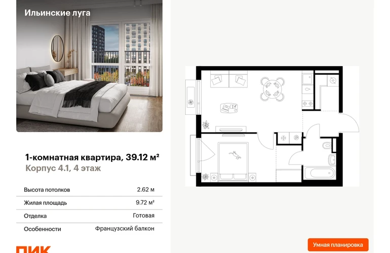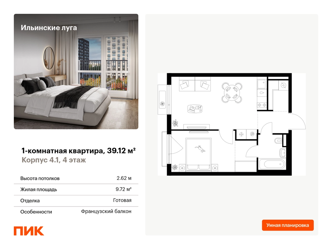 Продаётся 1-комн.квартира площадью 39.12 кв.м на 4 этаже 9 этажного дома (Корпус 4.1, секция 1) проекта ПИК Ильинские луга. Светлый просторный подъезд на уровне земли, функциональная планировка, большие окна, с отделкой. <br> <br>Жилой район «Ильинские луга» находится в 10 километрах от МКАД по Новорижскому шоссе, в 20 минутах на автомобиле от станций метро «Волоколамская», «Тушинская» и «Строгино». В будущем ближе к проекту, в 9 минутах пути на машине, откроется станция «Ильинская» Рублёво-Архангельской линии, которая будет соединять Арбатско-Покровскую линию и Большую кольцевую линию. <br> <br>«Ильинские луга» — масштабный проект, в который входит девять детских садов, четыре школы и поликлиника. Он строится в престижном и экологичном районе среди лесов и памятников природы. За 5 минут от жилого квартала можно доехать до Рублёво-Успенского шоссе, а за 30 минут — до центра Москвы. До крупного торгового центра «РИГАМОЛЛ» всего 5 минут на автомобиле, а до ТЦ «Твой дом» и гипермаркета «Глобус» — 10 минут. <br> <br>В «Ильинских лугах» строятся только девятиэтажные дома — такая архитектура соответствует спокойной жизни за городом. В каждом дворе-парке есть места для отдыха, детские и спортивные площадки. А ещё, здесь уже открыт большой PlayHub «Гравити» — современное игровое пространство с космической тематикой, холмами, зонами для игр и отдыха жителей любого возраста. <br> <br>На первых этажах уже работают магазины, кафе и пекарни. <br> <br>Места для отдыха от «Ильинских лугов» тоже недалеко: 10 минут на машине — и вы в музее-усадьбе «Архангельское». Также рядом находится Лохин остров — памятник природы, где водятся речные черепахи, есть места для кемпинга и возможность сплавиться по реке. Артикул - 1015717О застройщике
