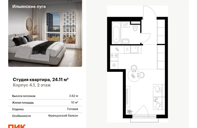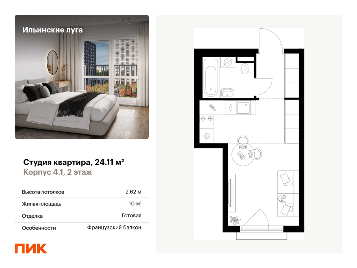 Продаётся квартира-студия площадью 24.11 кв.м на 2 этаже 9 этажного дома (Корпус 4.1, секция 1) проекта ПИК Ильинские луга. Светлый просторный подъезд на уровне земли, функциональная планировка, большие окна, с отделкой. <br> <br>Жилой район «Ильинские луга» находится в 10 километрах от МКАД по Новорижскому шоссе, в 20 минутах на автомобиле от станций метро «Волоколамская», «Тушинская» и «Строгино». В будущем ближе к проекту, в 9 минутах пути на машине, откроется станция «Ильинская» Рублёво-Архангельской линии, которая будет соединять Арбатско-Покровскую линию и Большую кольцевую линию. <br> <br>«Ильинские луга» — масштабный проект, в который входит девять детских садов, четыре школы и поликлиника. Он строится в престижном и экологичном районе среди лесов и памятников природы. За 5 минут от жилого квартала можно доехать до Рублёво-Успенского шоссе, а за 30 минут — до центра Москвы. До крупного торгового центра «РИГАМОЛЛ» всего 5 минут на автомобиле, а до ТЦ «Твой дом» и гипермаркета «Глобус» — 10 минут. <br> <br>В «Ильинских лугах» строятся только девятиэтажные дома — такая архитектура соответствует спокойной жизни за городом. В каждом дворе-парке есть места для отдыха, детские и спортивные площадки. А ещё, здесь уже открыт большой PlayHub «Гравити» — современное игровое пространство с космической тематикой, холмами, зонами для игр и отдыха жителей любого возраста. <br> <br>На первых этажах уже работают магазины, кафе и пекарни. <br> <br>Места для отдыха от «Ильинских лугов» тоже недалеко: 10 минут на машине — и вы в музее-усадьбе «Архангельское». Также рядом находится Лохин остров — памятник природы, где водятся речные черепахи, есть места для кемпинга и возможность сплавиться по реке. Артикул - 1015696О застройщике