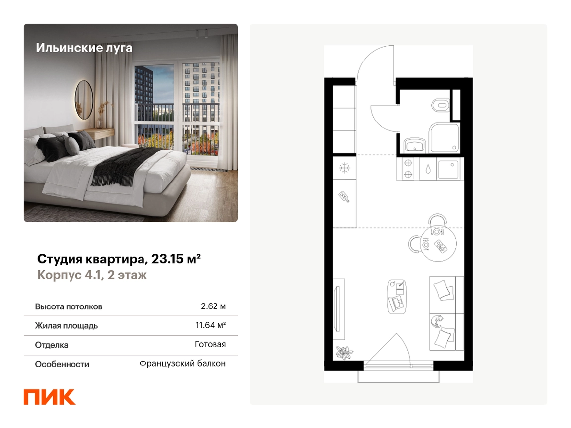 Продаётся квартира-студия площадью 23.15 кв.м на 2 этаже 9 этажного дома (Корпус 4.1, секция 1) проекта ПИК Ильинские луга. Светлый просторный подъезд на уровне земли, функциональная планировка, большие окна, с отделкой. Жилой район «Ильинские луга» находится в 10 километрах от МКАД по Новорижскому шоссе, в 20 минутах на автомобиле от станций метро «Волоколамская», «Тушинская» и «Строгино». В будущем ближе к проекту, в 9 минутах пути на машине, откроется станция «Ильинская» Рублёво-Архангельской линии, которая будет соединять Арбатско-Покровскую линию и Большую кольцевую линию. «Ильинские луга» — масштабный проект, в который входит девять детских садов, четыре школы и поликлиника. Он строится в престижном и экологичном районе среди лесов и памятников природы. За 5 минут от жилого квартала можно доехать до Рублёво-Успенского шоссе, а за 30 минут — до центра Москвы. До крупного торгового центра «РИГАМОЛЛ» всего 5 минут на автомобиле, а до ТЦ «Твой дом» и гипермаркета «Глобус» — 10 минут. В «Ильинских лугах» строятся только девятиэтажные дома — такая архитектура соответствует спокойной жизни за городом. В каждом дворе-парке есть места для отдыха, детские и спортивные площадки. А ещё, здесь уже открыт большой PlayHub «Гравити» — современное игровое пространство с космической тематикой, холмами, зонами для игр и отдыха жителей любого возраста. На первых этажах уже работают магазины, кафе и пекарни. Места для отдыха от «Ильинских лугов» тоже недалеко: 10 минут на машине — и вы в музее-усадьбе «Архангельское». Также рядом находится Лохин остров — памятник природы, где водятся речные черепахи, есть места для кемпинга и возможность сплавиться по реке. Артикул - 1015693О застройщике