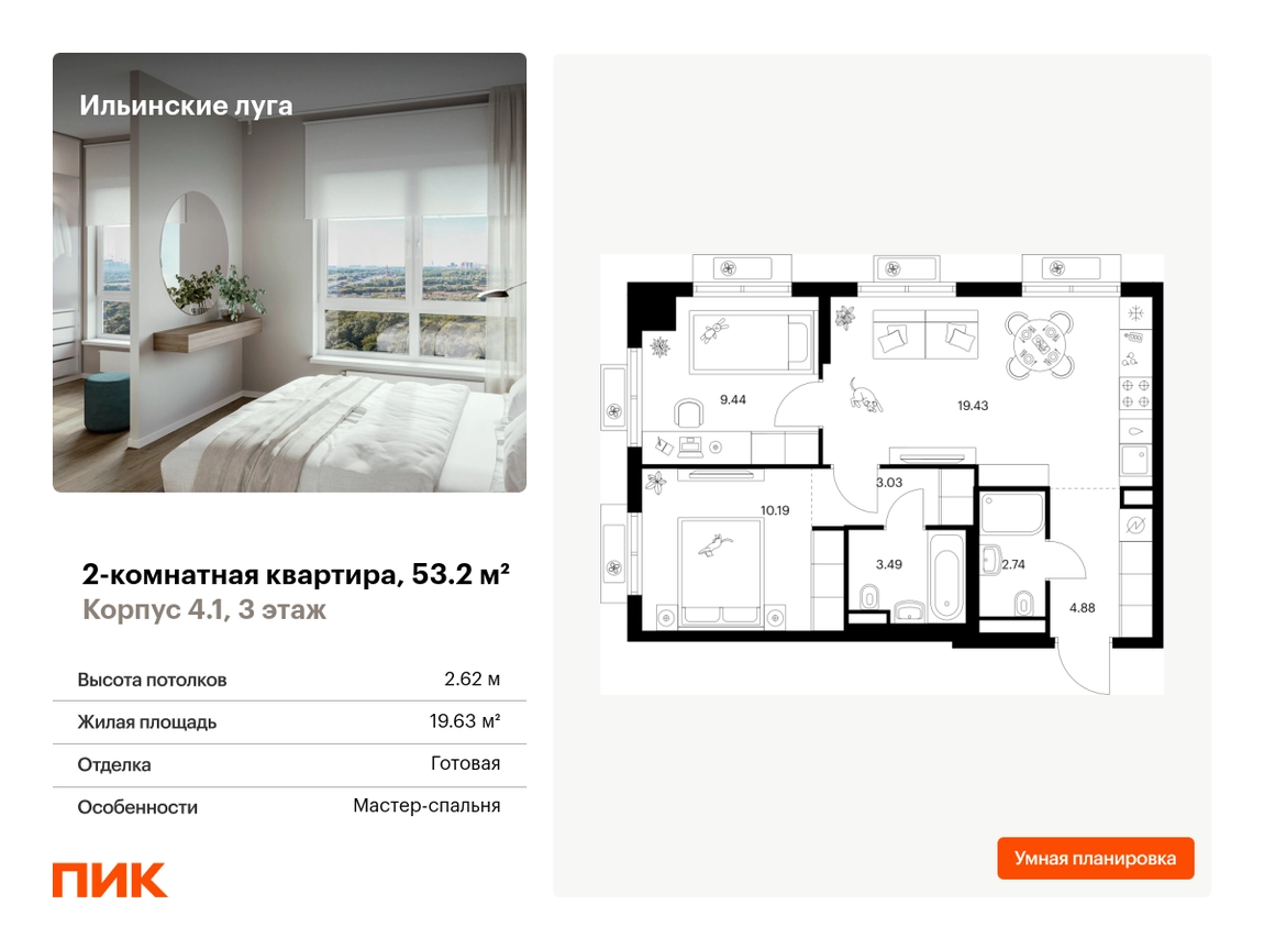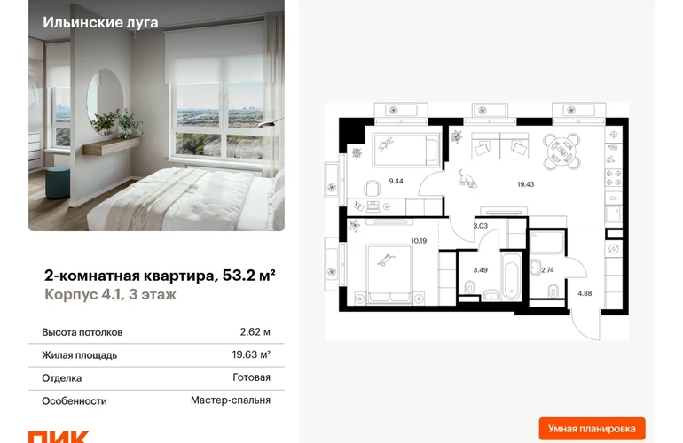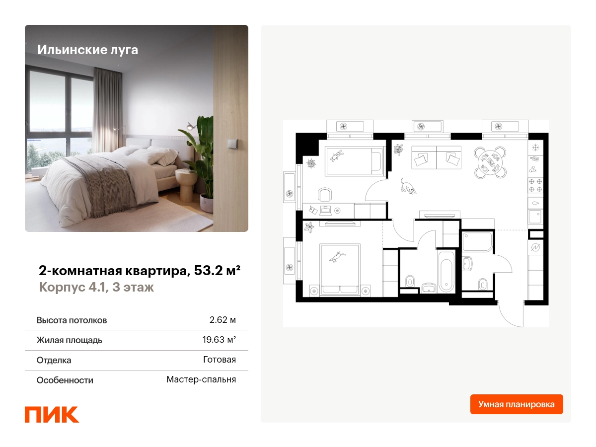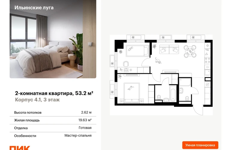 Продаётся 2-комн.квартира площадью 53.20 кв.м на 3 этаже 9 этажного дома (Корпус 4.1, секция 6) проекта ПИК Ильинские луга. Светлый просторный подъезд на уровне земли, функциональная планировка, большие окна, с отделкой. Жилой район «Ильинские луга» находится в 10 километрах от МКАД по Новорижскому шоссе, в 20 минутах на автомобиле от станций метро «Волоколамская», «Тушинская» и «Строгино». В будущем ближе к проекту, в 9 минутах пути на машине, откроется станция «Ильинская» Рублёво-Архангельской линии, которая будет соединять Арбатско-Покровскую линию и Большую кольцевую линию. «Ильинские луга» — масштабный проект, в который входит девять детских садов, четыре школы и поликлиника. Он строится в престижном и экологичном районе среди лесов и памятников природы. За 5 минут от жилого квартала можно доехать до Рублёво-Успенского шоссе, а за 30 минут — до центра Москвы. До крупного торгового центра «РИГАМОЛЛ» всего 5 минут на автомобиле, а до ТЦ «Твой дом» и гипермаркета «Глобус» — 10 минут. В «Ильинских лугах» строятся только девятиэтажные дома — такая архитектура соответствует спокойной жизни за городом. В каждом дворе-парке есть места для отдыха, детские и спортивные площадки. А ещё, здесь уже открыт большой PlayHub «Гравити» — современное игровое пространство с космической тематикой, холмами, зонами для игр и отдыха жителей любого возраста. На первых этажах уже работают магазины, кафе и пекарни. Места для отдыха от «Ильинских лугов» тоже недалеко: 10 минут на машине — и вы в музее-усадьбе «Архангельское». Также рядом находится Лохин остров — памятник природы, где водятся речные черепахи, есть места для кемпинга и возможность сплавиться по реке. Артикул - 1016282О застройщике