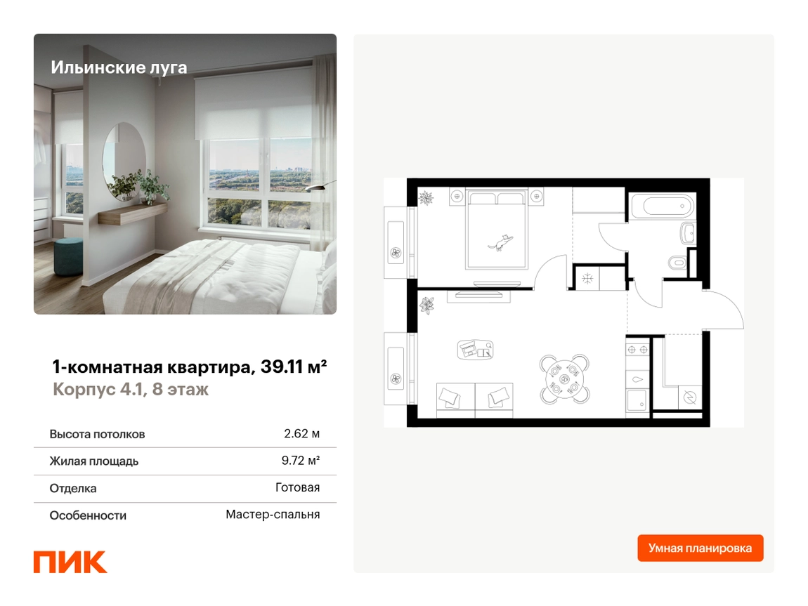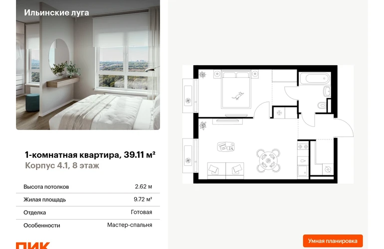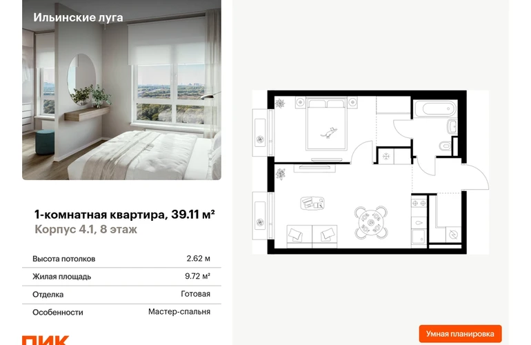 Продаётся 1-комн.квартира площадью 39.11 кв.м на 8 этаже 9 этажного дома (Корпус 4.1, секция 1) проекта ПИК Ильинские луга. Светлый просторный подъезд на уровне земли, функциональная планировка, большие окна, с отделкой. Жилой район «Ильинские луга» находится в 10 километрах от МКАД по Новорижскому шоссе, в 20 минутах на автомобиле от станций метро «Волоколамская», «Тушинская» и «Строгино». В будущем ближе к проекту, в 9 минутах пути на машине, откроется станция «Ильинская» Рублёво-Архангельской линии, которая будет соединять Арбатско-Покровскую линию и Большую кольцевую линию. «Ильинские луга» — масштабный проект, в который входит девять детских садов, четыре школы и поликлиника. Он строится в престижном и экологичном районе среди лесов и памятников природы. За 5 минут от жилого квартала можно доехать до Рублёво-Успенского шоссе, а за 30 минут — до центра Москвы. До крупного торгового центра «РИГАМОЛЛ» всего 5 минут на автомобиле, а до ТЦ «Твой дом» и гипермаркета «Глобус» — 10 минут. В «Ильинских лугах» строятся только девятиэтажные дома — такая архитектура соответствует спокойной жизни за городом. В каждом дворе-парке есть места для отдыха, детские и спортивные площадки. А ещё, здесь уже открыт большой PlayHub «Гравити» — современное игровое пространство с космической тематикой, холмами, зонами для игр и отдыха жителей любого возраста. На первых этажах уже работают магазины, кафе и пекарни. Места для отдыха от «Ильинских лугов» тоже недалеко: 10 минут на машине — и вы в музее-усадьбе «Архангельское». Также рядом находится Лохин остров — памятник природы, где водятся речные черепахи, есть места для кемпинга и возможность сплавиться по реке. Артикул - 1015770О застройщике