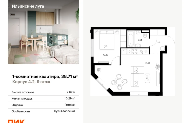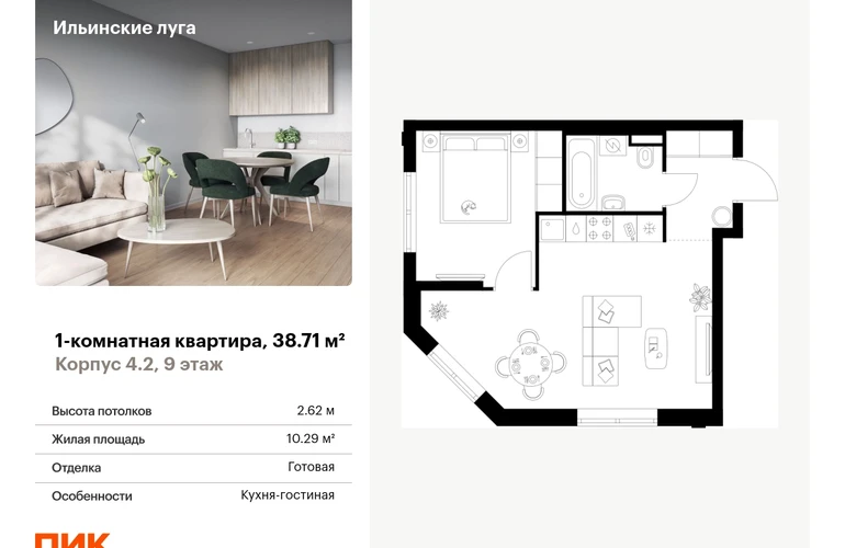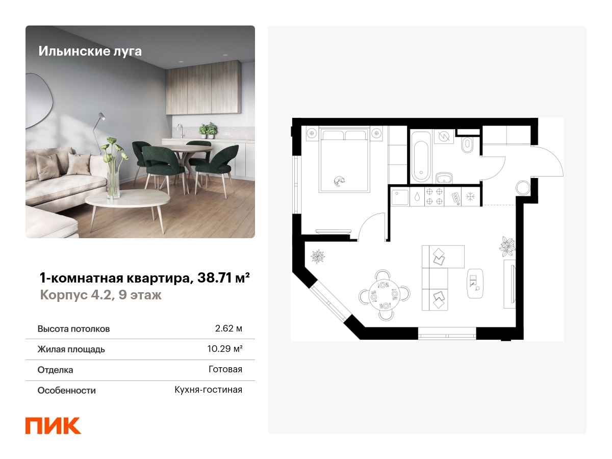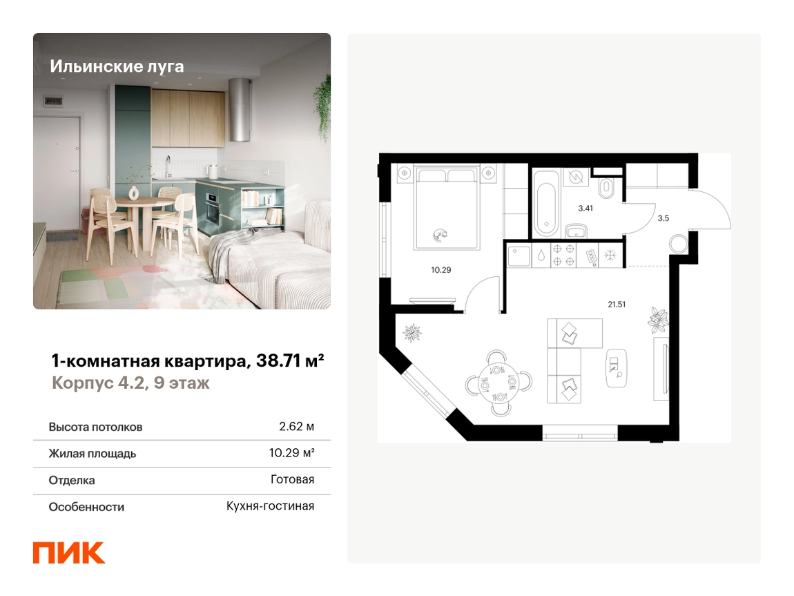 Продаётся 1-комн.квартира площадью 38.71 кв.м на 9 этаже 9 этажного дома (Корпус 4.2, секция 2) проекта ПИК Ильинские луга. Светлый просторный подъезд на уровне земли, функциональная планировка, большие окна, с отделкой. Жилой район «Ильинские луга» находится в 10 километрах от МКАД по Новорижскому шоссе, в 20 минутах на автомобиле от станций метро «Волоколамская», «Тушинская» и «Строгино». В будущем ближе к проекту, в 9 минутах пути на машине, откроется станция «Ильинская» Рублёво-Архангельской линии, которая будет соединять Арбатско-Покровскую линию и Большую кольцевую линию. «Ильинские луга» — масштабный проект, в который входит девять детских садов, четыре школы и поликлиника. Он строится в престижном и экологичном районе среди лесов и памятников природы. За 5 минут от жилого квартала можно доехать до Рублёво-Успенского шоссе, а за 30 минут — до центра Москвы. До крупного торгового центра «РИГАМОЛЛ» всего 5 минут на автомобиле, а до ТЦ «Твой дом» и гипермаркета «Глобус» — 10 минут. В «Ильинских лугах» строятся только девятиэтажные дома — такая архитектура соответствует спокойной жизни за городом. В каждом дворе-парке есть места для отдыха, детские и спортивные площадки. А ещё, здесь уже открыт большой PlayHub «Гравити» — современное игровое пространство с космической тематикой, холмами, зонами для игр и отдыха жителей любого возраста. На первых этажах уже работают магазины, кафе и пекарни. Места для отдыха от «Ильинских лугов» тоже недалеко: 10 минут на машине — и вы в музее-усадьбе «Архангельское». Также рядом находится Лохин остров — памятник природы, где водятся речные черепахи, есть места для кемпинга и возможность сплавиться по реке. Артикул - 1015490О застройщике