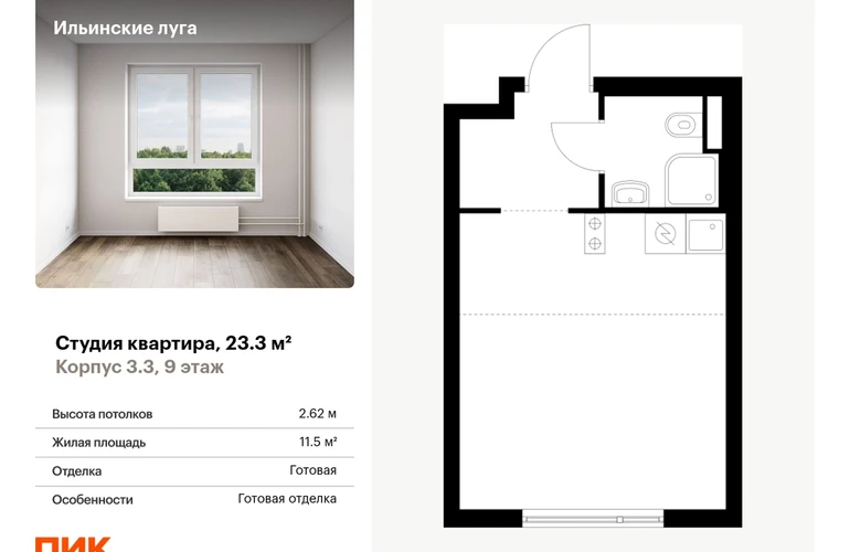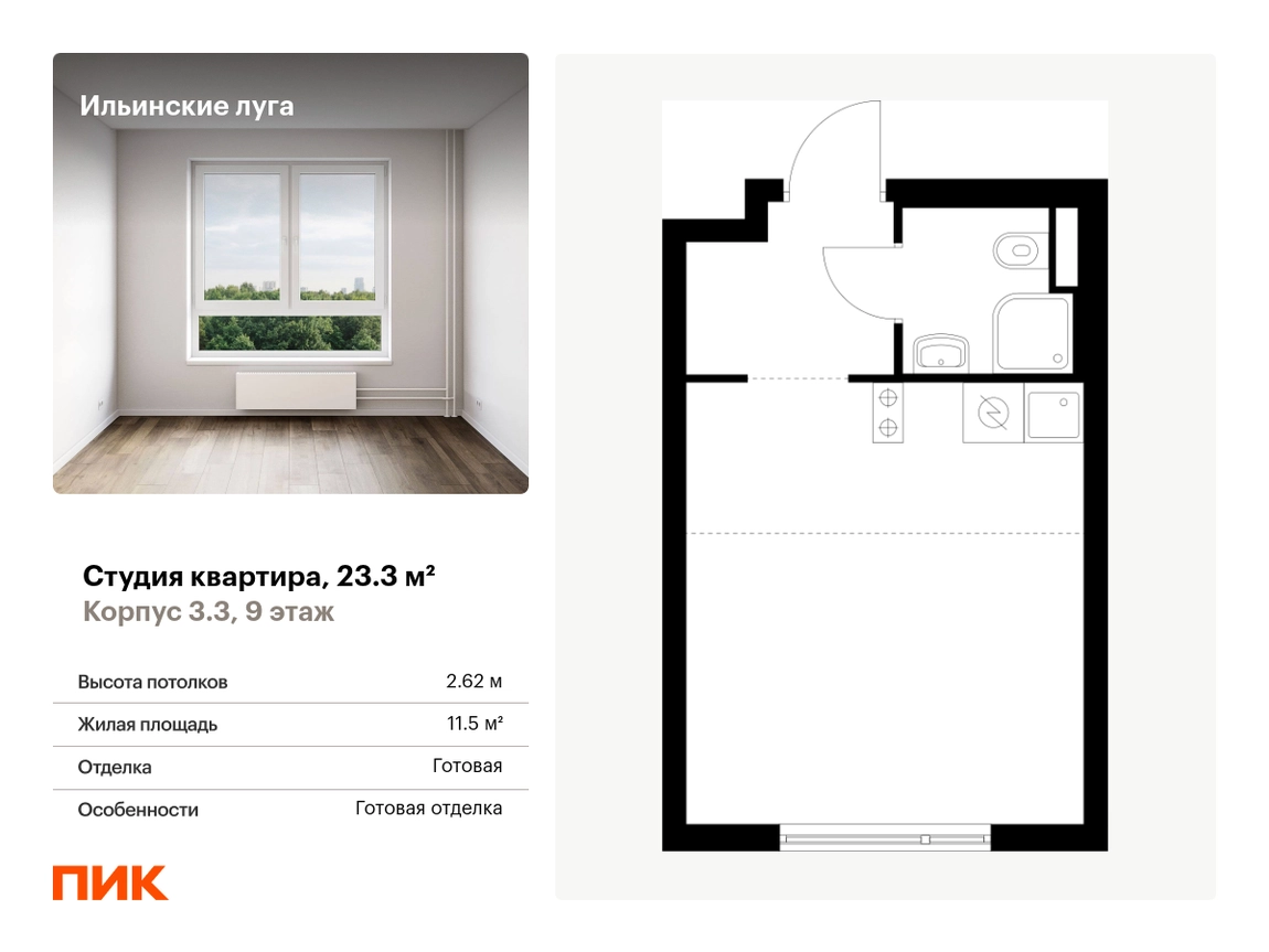 Продаётся квартира-студия площадью 23.30 кв.м на 9 этаже 9 этажного дома (Корпус 3.3, секция 5) проекта ПИК Ильинские луга. Светлый просторный подъезд на уровне земли, функциональная планировка, большие окна, с отделкой. <br> <br>Жилой район «Ильинские луга» находится в 10 километрах от МКАД по Новорижскому шоссе, в 20 минутах на автомобиле от станций метро «Волоколамская», «Тушинская» и «Строгино». В будущем ближе к проекту, в 9 минутах пути на машине, откроется станция «Ильинская» Рублёво-Архангельской линии, которая будет соединять Арбатско-Покровскую линию и Большую кольцевую линию. <br> <br>«Ильинские луга» — масштабный проект, в который входит девять детских садов, четыре школы и поликлиника. Он строится в престижном и экологичном районе среди лесов и памятников природы. За 5 минут от жилого квартала можно доехать до Рублёво-Успенского шоссе, а за 30 минут — до центра Москвы. До крупного торгового центра «РИГАМОЛЛ» всего 5 минут на автомобиле, а до ТЦ «Твой дом» и гипермаркета «Глобус» — 10 минут. <br> <br>В «Ильинских лугах» строятся только девятиэтажные дома — такая архитектура соответствует спокойной жизни за городом. В каждом дворе-парке есть места для отдыха, детские и спортивные площадки. А ещё, здесь уже открыт большой PlayHub «Гравити» — современное игровое пространство с космической тематикой, холмами, зонами для игр и отдыха жителей любого возраста. <br> <br>На первых этажах уже работают магазины, кафе и пекарни. <br> <br>Места для отдыха от «Ильинских лугов» тоже недалеко: 10 минут на машине — и вы в музее-усадьбе «Архангельское». Также рядом находится Лохин остров — памятник природы, где водятся речные черепахи, есть места для кемпинга и возможность сплавиться по реке. Артикул - 993866О застройщике
