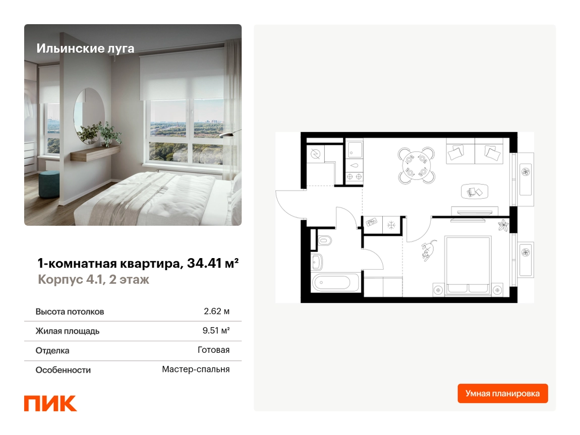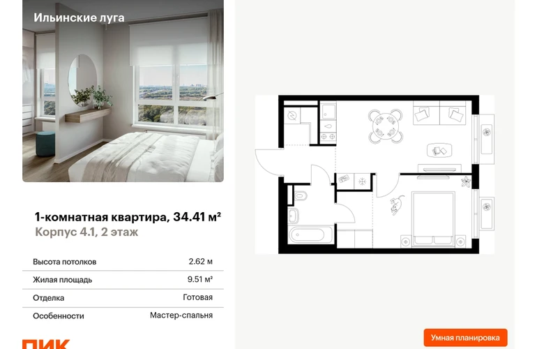 Продаётся 1-комн.квартира площадью 34.41 кв.м на 2 этаже 9 этажного дома (Корпус 4.1, секция 5) проекта ПИК Ильинские луга. Светлый просторный подъезд на уровне земли, функциональная планировка, большие окна, с отделкой. Жилой район «Ильинские луга» находится в 10 километрах от МКАД по Новорижскому шоссе, в 20 минутах на автомобиле от станций метро «Волоколамская», «Тушинская» и «Строгино». В будущем ближе к проекту, в 9 минутах пути на машине, откроется станция «Ильинская» Рублёво-Архангельской линии, которая будет соединять Арбатско-Покровскую линию и Большую кольцевую линию. «Ильинские луга» — масштабный проект, в который входит девять детских садов, четыре школы и поликлиника. Он строится в престижном и экологичном районе среди лесов и памятников природы. За 5 минут от жилого квартала можно доехать до Рублёво-Успенского шоссе, а за 30 минут — до центра Москвы. До крупного торгового центра «РИГАМОЛЛ» всего 5 минут на автомобиле, а до ТЦ «Твой дом» и гипермаркета «Глобус» — 10 минут. В «Ильинских лугах» строятся только девятиэтажные дома — такая архитектура соответствует спокойной жизни за городом. В каждом дворе-парке есть места для отдыха, детские и спортивные площадки. А ещё, здесь уже открыт большой PlayHub «Гравити» — современное игровое пространство с космической тематикой, холмами, зонами для игр и отдыха жителей любого возраста. На первых этажах уже работают магазины, кафе и пекарни. Места для отдыха от «Ильинских лугов» тоже недалеко: 10 минут на машине — и вы в музее-усадьбе «Архангельское». Также рядом находится Лохин остров — памятник природы, где водятся речные черепахи, есть места для кемпинга и возможность сплавиться по реке. Артикул - 1016143О застройщике