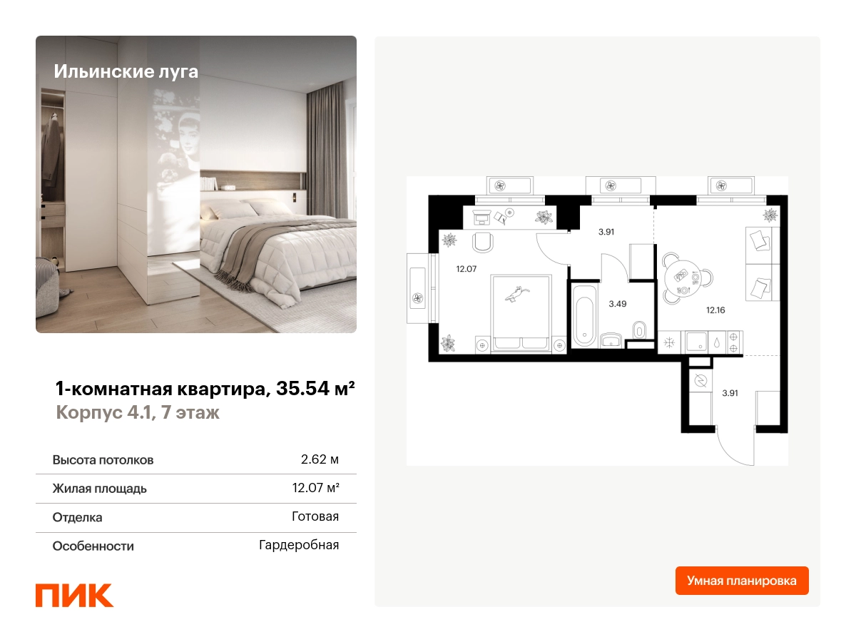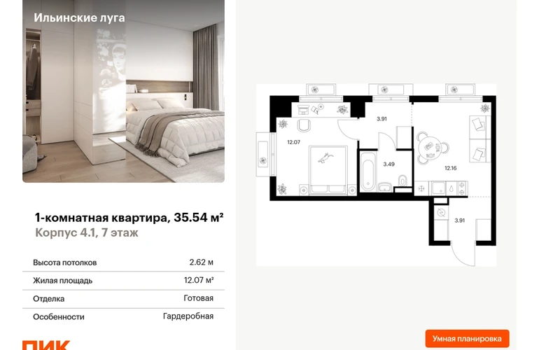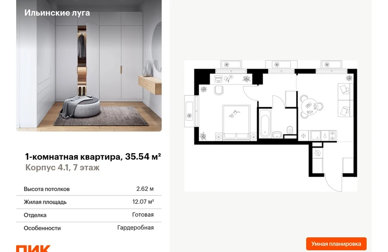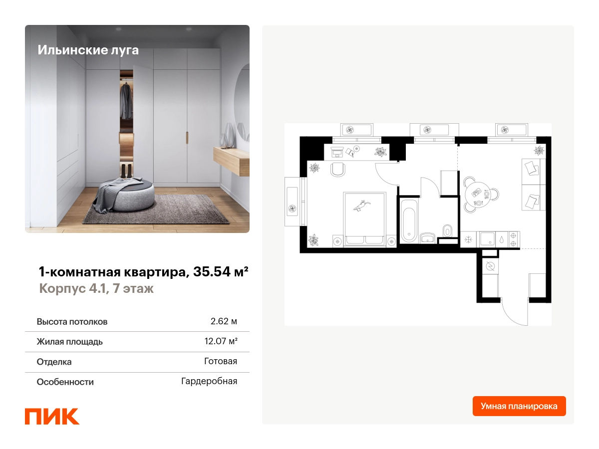 Продаётся 1-комн.квартира площадью 35.54 кв.м на 7 этаже 9 этажного дома (Корпус 4.1, секция 6) проекта ПИК Ильинские луга. Светлый просторный подъезд на уровне земли, функциональная планировка, большие окна, с отделкой. Жилой район «Ильинские луга» находится в 10 километрах от МКАД по Новорижскому шоссе, в 20 минутах на автомобиле от станций метро «Волоколамская», «Тушинская» и «Строгино». В будущем ближе к проекту, в 9 минутах пути на машине, откроется станция «Ильинская» Рублёво-Архангельской линии, которая будет соединять Арбатско-Покровскую линию и Большую кольцевую линию. «Ильинские луга» — масштабный проект, в который входит девять детских садов, четыре школы и поликлиника. Он строится в престижном и экологичном районе среди лесов и памятников природы. За 5 минут от жилого квартала можно доехать до Рублёво-Успенского шоссе, а за 30 минут — до центра Москвы. До крупного торгового центра «РИГАМОЛЛ» всего 5 минут на автомобиле, а до ТЦ «Твой дом» и гипермаркета «Глобус» — 10 минут. В «Ильинских лугах» строятся только девятиэтажные дома — такая архитектура соответствует спокойной жизни за городом. В каждом дворе-парке есть места для отдыха, детские и спортивные площадки. А ещё, здесь уже открыт большой PlayHub «Гравити» — современное игровое пространство с космической тематикой, холмами, зонами для игр и отдыха жителей любого возраста. На первых этажах уже работают магазины, кафе и пекарни. Места для отдыха от «Ильинских лугов» тоже недалеко: 10 минут на машине — и вы в музее-усадьбе «Архангельское». Также рядом находится Лохин остров — памятник природы, где водятся речные черепахи, есть места для кемпинга и возможность сплавиться по реке. Артикул - 1016305О застройщике