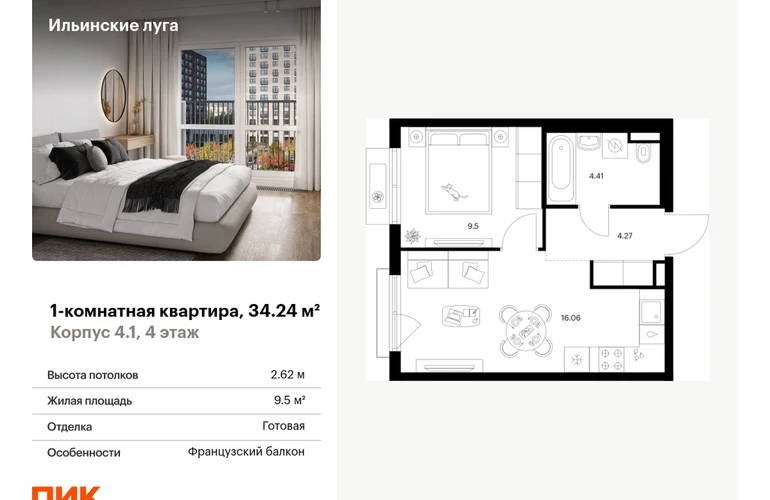 Продаётся 1-комн.квартира площадью 34.24 кв.м на 4 этаже 9 этажного дома (Корпус 4.1, секция 6) проекта ПИК Ильинские луга. Светлый просторный подъезд на уровне земли, функциональная планировка, большие окна, с отделкой. Жилой район «Ильинские луга» находится в 10 километрах от МКАД по Новорижскому шоссе, в 20 минутах на автомобиле от станций метро «Волоколамская», «Тушинская» и «Строгино». В будущем ближе к проекту, в 9 минутах пути на машине, откроется станция «Ильинская» Рублёво-Архангельской линии, которая будет соединять Арбатско-Покровскую линию и Большую кольцевую линию. «Ильинские луга» — масштабный проект, в который входит девять детских садов, четыре школы и поликлиника. Он строится в престижном и экологичном районе среди лесов и памятников природы. За 5 минут от жилого квартала можно доехать до Рублёво-Успенского шоссе, а за 30 минут — до центра Москвы. До крупного торгового центра «РИГАМОЛЛ» всего 5 минут на автомобиле, а до ТЦ «Твой дом» и гипермаркета «Глобус» — 10 минут. В «Ильинских лугах» строятся только девятиэтажные дома — такая архитектура соответствует спокойной жизни за городом. В каждом дворе-парке есть места для отдыха, детские и спортивные площадки. А ещё, здесь уже открыт большой PlayHub «Гравити» — современное игровое пространство с космической тематикой, холмами, зонами для игр и отдыха жителей любого возраста. На первых этажах уже работают магазины, кафе и пекарни. Места для отдыха от «Ильинских лугов» тоже недалеко: 10 минут на машине — и вы в музее-усадьбе «Архангельское». Также рядом находится Лохин остров — памятник природы, где водятся речные черепахи, есть места для кемпинга и возможность сплавиться по реке. Артикул - 1016284О застройщике