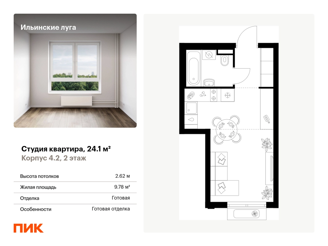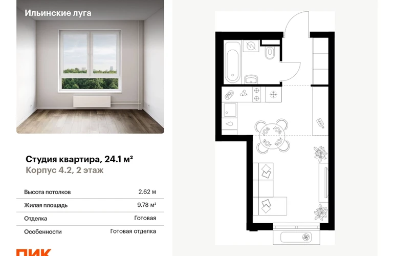 Продаётся квартира-студия площадью 24.10 кв.м на 2 этаже 9 этажного дома (Корпус 4.2, секция 2) проекта ПИК Ильинские луга. Светлый просторный подъезд на уровне земли, функциональная планировка, большие окна, с отделкой. <br> <br>Жилой район «Ильинские луга» находится в 10 километрах от МКАД по Новорижскому шоссе, в 20 минутах на автомобиле от станций метро «Волоколамская», «Тушинская» и «Строгино». В будущем ближе к проекту, в 9 минутах пути на машине, откроется станция «Ильинская» Рублёво-Архангельской линии, которая будет соединять Арбатско-Покровскую линию и Большую кольцевую линию. <br> <br>«Ильинские луга» — масштабный проект, в который входит девять детских садов, четыре школы и поликлиника. Он строится в престижном и экологичном районе среди лесов и памятников природы. За 5 минут от жилого квартала можно доехать до Рублёво-Успенского шоссе, а за 30 минут — до центра Москвы. До крупного торгового центра «РИГАМОЛЛ» всего 5 минут на автомобиле, а до ТЦ «Твой дом» и гипермаркета «Глобус» — 10 минут. <br> <br>В «Ильинских лугах» строятся только девятиэтажные дома — такая архитектура соответствует спокойной жизни за городом. В каждом дворе-парке есть места для отдыха, детские и спортивные площадки. А ещё, здесь уже открыт большой PlayHub «Гравити» — современное игровое пространство с космической тематикой, холмами, зонами для игр и отдыха жителей любого возраста. <br> <br>На первых этажах уже работают магазины, кафе и пекарни. <br> <br>Места для отдыха от «Ильинских лугов» тоже недалеко: 10 минут на машине — и вы в музее-усадьбе «Архангельское». Также рядом находится Лохин остров — памятник природы, где водятся речные черепахи, есть места для кемпинга и возможность сплавиться по реке. Артикул - 1015394О застройщике
