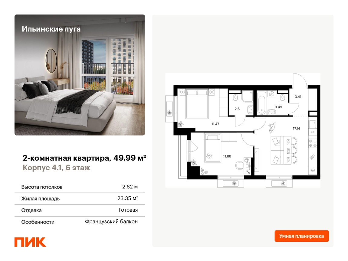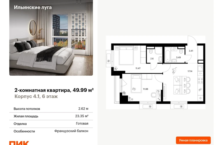 Продаётся 2-комн.квартира площадью 49.99 кв.м на 6 этаже 9 этажного дома (Корпус 4.1, секция 1) проекта ПИК Ильинские луга. Светлый просторный подъезд на уровне земли, функциональная планировка, большие окна, с отделкой. Жилой район «Ильинские луга» находится в 10 километрах от МКАД по Новорижскому шоссе, в 20 минутах на автомобиле от станций метро «Волоколамская», «Тушинская» и «Строгино». В будущем ближе к проекту, в 9 минутах пути на машине, откроется станция «Ильинская» Рублёво-Архангельской линии, которая будет соединять Арбатско-Покровскую линию и Большую кольцевую линию. «Ильинские луга» — масштабный проект, в который входит девять детских садов, четыре школы и поликлиника. Он строится в престижном и экологичном районе среди лесов и памятников природы. За 5 минут от жилого квартала можно доехать до Рублёво-Успенского шоссе, а за 30 минут — до центра Москвы. До крупного торгового центра «РИГАМОЛЛ» всего 5 минут на автомобиле, а до ТЦ «Твой дом» и гипермаркета «Глобус» — 10 минут. В «Ильинских лугах» строятся только девятиэтажные дома — такая архитектура соответствует спокойной жизни за городом. В каждом дворе-парке есть места для отдыха, детские и спортивные площадки. А ещё, здесь уже открыт большой PlayHub «Гравити» — современное игровое пространство с космической тематикой, холмами, зонами для игр и отдыха жителей любого возраста. На первых этажах уже работают магазины, кафе и пекарни. Места для отдыха от «Ильинских лугов» тоже недалеко: 10 минут на машине — и вы в музее-усадьбе «Архангельское». Также рядом находится Лохин остров — памятник природы, где водятся речные черепахи, есть места для кемпинга и возможность сплавиться по реке. Артикул - 1015742О застройщике