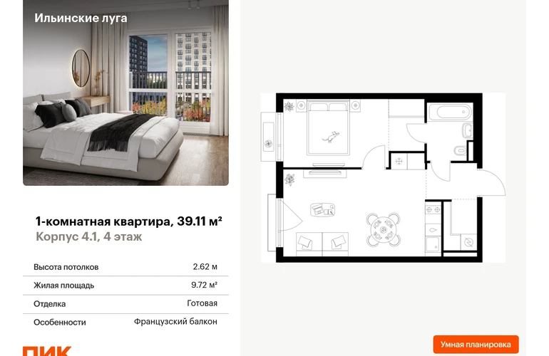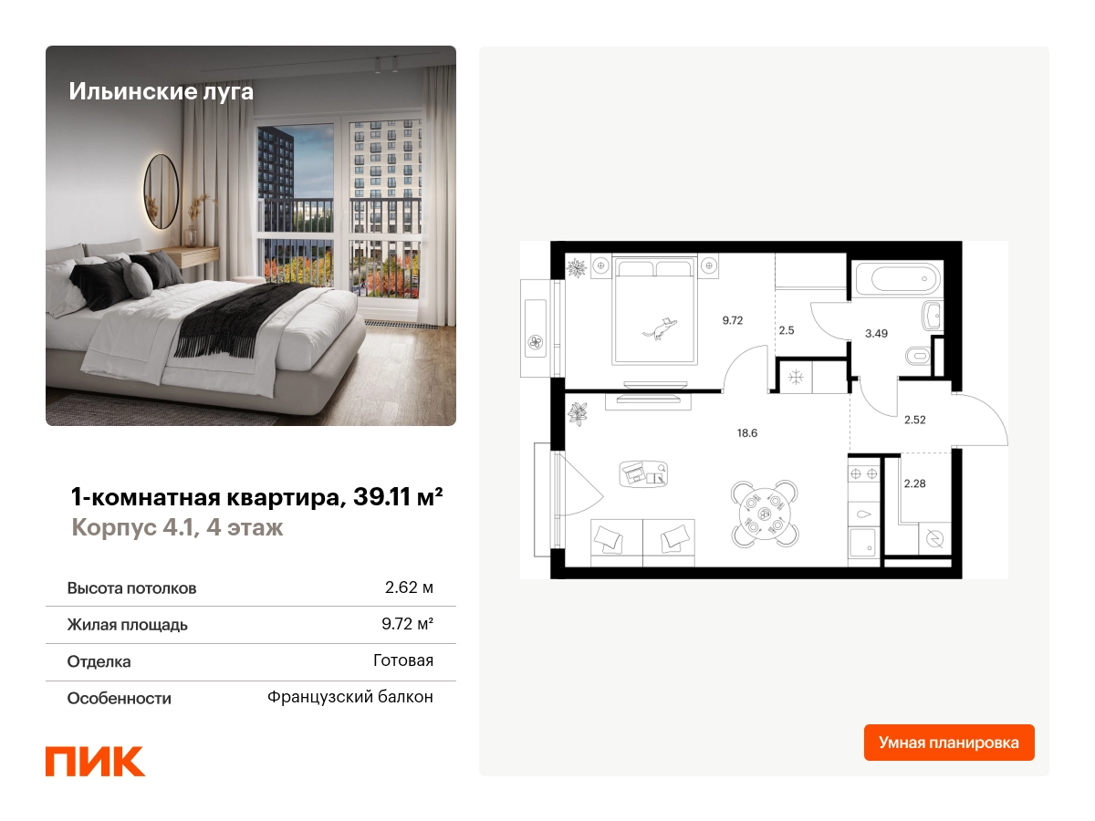 Продаётся 1-комн.квартира площадью 39.11 кв.м на 4 этаже 9 этажного дома (Корпус 4.1, секция 1) проекта ПИК Ильинские луга. Светлый просторный подъезд на уровне земли, функциональная планировка, большие окна, с отделкой. Жилой район «Ильинские луга» находится в 10 километрах от МКАД по Новорижскому шоссе, в 20 минутах на автомобиле от станций метро «Волоколамская», «Тушинская» и «Строгино». В будущем ближе к проекту, в 9 минутах пути на машине, откроется станция «Ильинская» Рублёво-Архангельской линии, которая будет соединять Арбатско-Покровскую линию и Большую кольцевую линию. «Ильинские луга» — масштабный проект, в который входит девять детских садов, четыре школы и поликлиника. Он строится в престижном и экологичном районе среди лесов и памятников природы. За 5 минут от жилого квартала можно доехать до Рублёво-Успенского шоссе, а за 30 минут — до центра Москвы. До крупного торгового центра «РИГАМОЛЛ» всего 5 минут на автомобиле, а до ТЦ «Твой дом» и гипермаркета «Глобус» — 10 минут. В «Ильинских лугах» строятся только девятиэтажные дома — такая архитектура соответствует спокойной жизни за городом. В каждом дворе-парке есть места для отдыха, детские и спортивные площадки. А ещё, здесь уже открыт большой PlayHub «Гравити» — современное игровое пространство с космической тематикой, холмами, зонами для игр и отдыха жителей любого возраста. На первых этажах уже работают магазины, кафе и пекарни. Места для отдыха от «Ильинских лугов» тоже недалеко: 10 минут на машине — и вы в музее-усадьбе «Архангельское». Также рядом находится Лохин остров — памятник природы, где водятся речные черепахи, есть места для кемпинга и возможность сплавиться по реке. Артикул - 1015718О застройщике