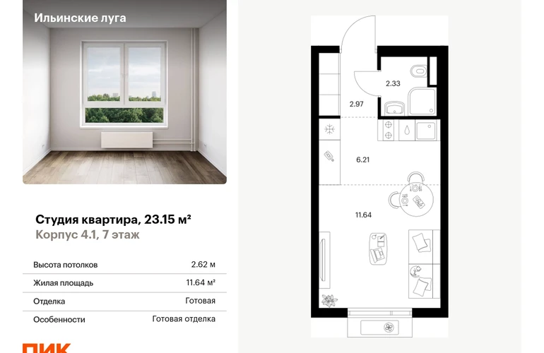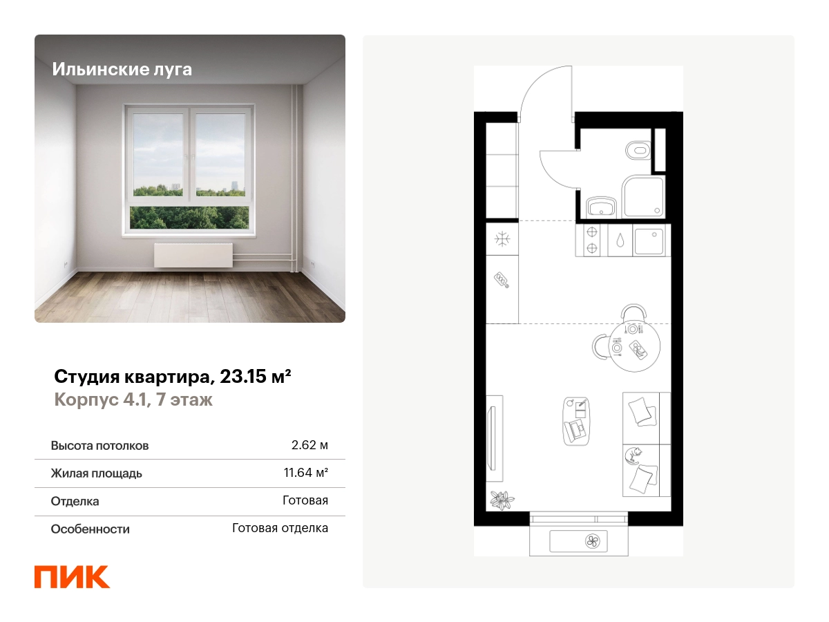 Продаётся квартира-студия площадью 23.15 кв.м на 7 этаже 9 этажного дома (Корпус 4.1, секция 1) проекта ПИК Ильинские луга. Светлый просторный подъезд на уровне земли, функциональная планировка, большие окна, с отделкой. <br> <br>Жилой район «Ильинские луга» находится в 10 километрах от МКАД по Новорижскому шоссе, в 20 минутах на автомобиле от станций метро «Волоколамская», «Тушинская» и «Строгино». В будущем ближе к проекту, в 9 минутах пути на машине, откроется станция «Ильинская» Рублёво-Архангельской линии, которая будет соединять Арбатско-Покровскую линию и Большую кольцевую линию. <br> <br>«Ильинские луга» — масштабный проект, в который входит девять детских садов, четыре школы и поликлиника. Он строится в престижном и экологичном районе среди лесов и памятников природы. За 5 минут от жилого квартала можно доехать до Рублёво-Успенского шоссе, а за 30 минут — до центра Москвы. До крупного торгового центра «РИГАМОЛЛ» всего 5 минут на автомобиле, а до ТЦ «Твой дом» и гипермаркета «Глобус» — 10 минут. <br> <br>В «Ильинских лугах» строятся только девятиэтажные дома — такая архитектура соответствует спокойной жизни за городом. В каждом дворе-парке есть места для отдыха, детские и спортивные площадки. А ещё, здесь уже открыт большой PlayHub «Гравити» — современное игровое пространство с космической тематикой, холмами, зонами для игр и отдыха жителей любого возраста. <br> <br>На первых этажах уже работают магазины, кафе и пекарни. <br> <br>Места для отдыха от «Ильинских лугов» тоже недалеко: 10 минут на машине — и вы в музее-усадьбе «Архангельское». Также рядом находится Лохин остров — памятник природы, где водятся речные черепахи, есть места для кемпинга и возможность сплавиться по реке. Артикул - 1015758О застройщике