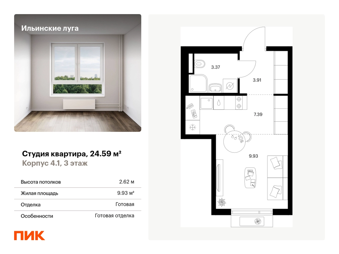 Продаётся квартира-студия площадью 24.59 кв.м на 3 этаже 9 этажного дома (Корпус 4.1, секция 5) проекта ПИК Ильинские луга. Светлый просторный подъезд на уровне земли, функциональная планировка, большие окна, с отделкой. Жилой район «Ильинские луга» находится в 10 километрах от МКАД по Новорижскому шоссе, в 20 минутах на автомобиле от станций метро «Волоколамская», «Тушинская» и «Строгино». В будущем ближе к проекту, в 9 минутах пути на машине, откроется станция «Ильинская» Рублёво-Архангельской линии, которая будет соединять Арбатско-Покровскую линию и Большую кольцевую линию. «Ильинские луга» — масштабный проект, в который входит девять детских садов, четыре школы и поликлиника. Он строится в престижном и экологичном районе среди лесов и памятников природы. За 5 минут от жилого квартала можно доехать до Рублёво-Успенского шоссе, а за 30 минут — до центра Москвы. До крупного торгового центра «РИГАМОЛЛ» всего 5 минут на автомобиле, а до ТЦ «Твой дом» и гипермаркета «Глобус» — 10 минут. В «Ильинских лугах» строятся только девятиэтажные дома — такая архитектура соответствует спокойной жизни за городом. В каждом дворе-парке есть места для отдыха, детские и спортивные площадки. А ещё, здесь уже открыт большой PlayHub «Гравити» — современное игровое пространство с космической тематикой, холмами, зонами для игр и отдыха жителей любого возраста. На первых этажах уже работают магазины, кафе и пекарни. Места для отдыха от «Ильинских лугов» тоже недалеко: 10 минут на машине — и вы в музее-усадьбе «Архангельское». Также рядом находится Лохин остров — памятник природы, где водятся речные черепахи, есть места для кемпинга и возможность сплавиться по реке. Артикул - 1016159О застройщике