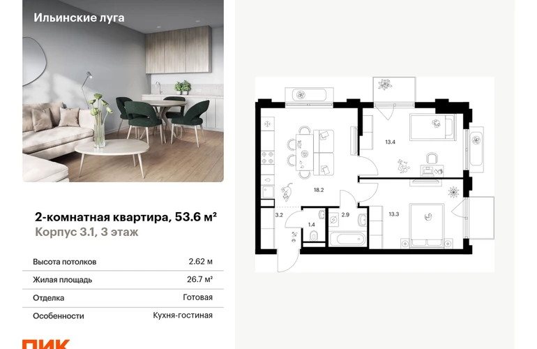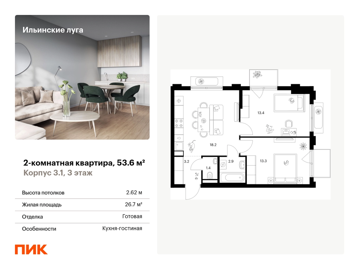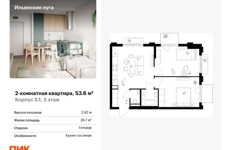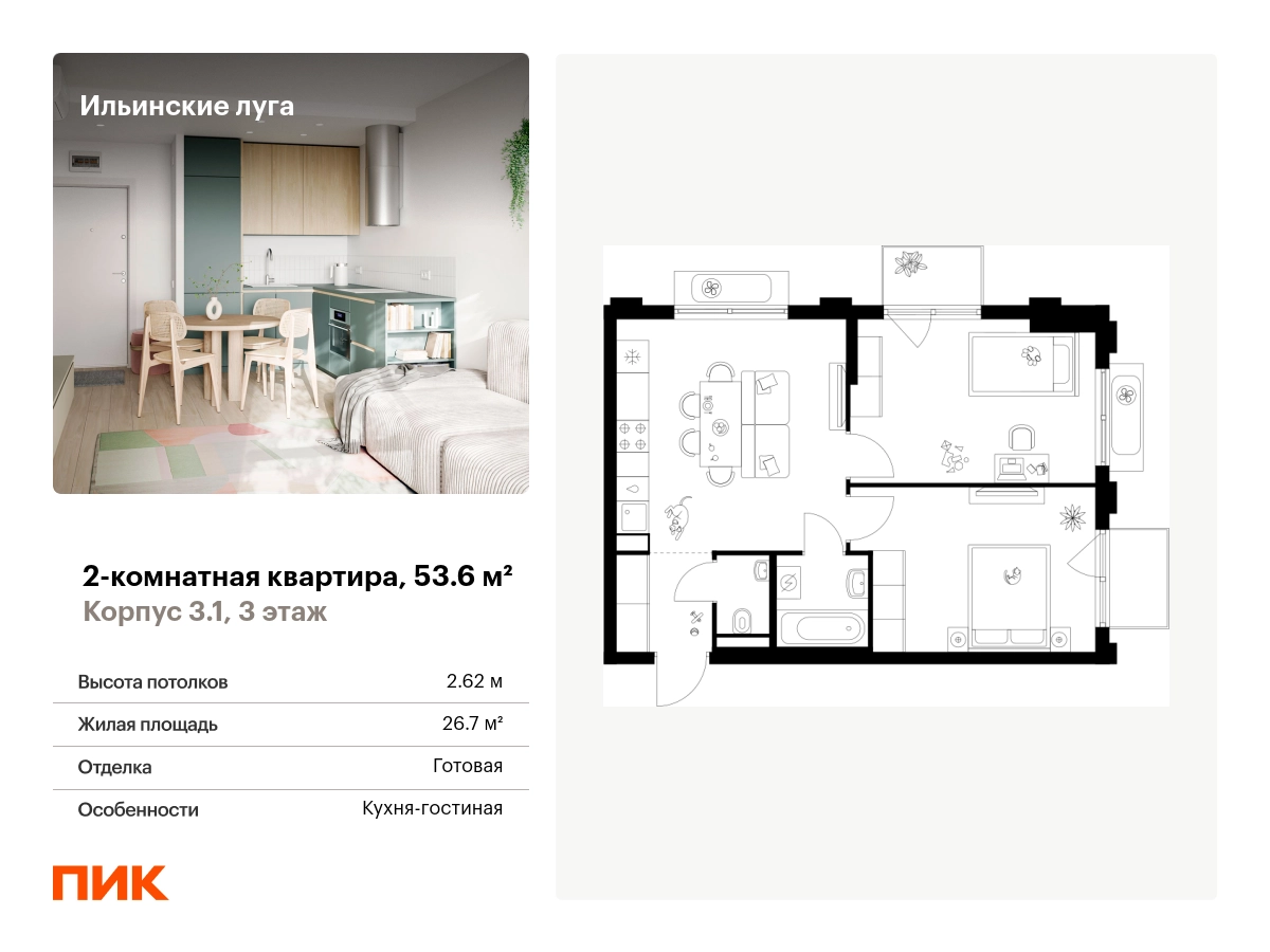 Продаётся 2-комн.квартира площадью 53.60 кв.м на 3 этаже 9 этажного дома (Корпус 3.1, секция 3) проекта ПИК Ильинские луга. Светлый просторный подъезд на уровне земли, функциональная планировка, большие окна, с отделкой. <br> <br>Жилой район «Ильинские луга» находится в 10 километрах от МКАД по Новорижскому шоссе, в 20 минутах на автомобиле от станций метро «Волоколамская», «Тушинская» и «Строгино». В будущем ближе к проекту, в 9 минутах пути на машине, откроется станция «Ильинская» Рублёво-Архангельской линии, которая будет соединять Арбатско-Покровскую линию и Большую кольцевую линию. <br> <br>«Ильинские луга» — масштабный проект, в который входит девять детских садов, четыре школы и поликлиника. Он строится в престижном и экологичном районе среди лесов и памятников природы. За 5 минут от жилого квартала можно доехать до Рублёво-Успенского шоссе, а за 30 минут — до центра Москвы. До крупного торгового центра «РИГАМОЛЛ» всего 5 минут на автомобиле, а до ТЦ «Твой дом» и гипермаркета «Глобус» — 10 минут. <br> <br>В «Ильинских лугах» строятся только девятиэтажные дома — такая архитектура соответствует спокойной жизни за городом. В каждом дворе-парке есть места для отдыха, детские и спортивные площадки. А ещё, здесь уже открыт большой PlayHub «Гравити» — современное игровое пространство с космической тематикой, холмами, зонами для игр и отдыха жителей любого возраста. <br> <br>На первых этажах уже работают магазины, кафе и пекарни. <br> <br>Места для отдыха от «Ильинских лугов» тоже недалеко: 10 минут на машине — и вы в музее-усадьбе «Архангельское». Также рядом находится Лохин остров — памятник природы, где водятся речные черепахи, есть места для кемпинга и возможность сплавиться по реке. Артикул - 1001665О застройщике