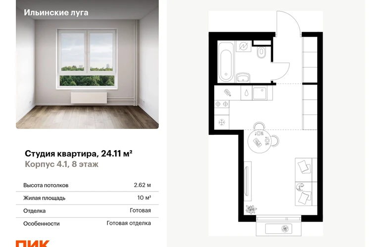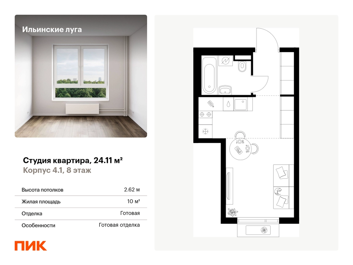 Продаётся квартира-студия площадью 24.11 кв.м на 8 этаже 9 этажного дома (Корпус 4.1, секция 1) проекта ПИК Ильинские луга. Светлый просторный подъезд на уровне земли, функциональная планировка, большие окна, с отделкой. Жилой район «Ильинские луга» находится в 10 километрах от МКАД по Новорижскому шоссе, в 20 минутах на автомобиле от станций метро «Волоколамская», «Тушинская» и «Строгино». В будущем ближе к проекту, в 9 минутах пути на машине, откроется станция «Ильинская» Рублёво-Архангельской линии, которая будет соединять Арбатско-Покровскую линию и Большую кольцевую линию. «Ильинские луга» — масштабный проект, в который входит девять детских садов, четыре школы и поликлиника. Он строится в престижном и экологичном районе среди лесов и памятников природы. За 5 минут от жилого квартала можно доехать до Рублёво-Успенского шоссе, а за 30 минут — до центра Москвы. До крупного торгового центра «РИГАМОЛЛ» всего 5 минут на автомобиле, а до ТЦ «Твой дом» и гипермаркета «Глобус» — 10 минут. В «Ильинских лугах» строятся только девятиэтажные дома — такая архитектура соответствует спокойной жизни за городом. В каждом дворе-парке есть места для отдыха, детские и спортивные площадки. А ещё, здесь уже открыт большой PlayHub «Гравити» — современное игровое пространство с космической тематикой, холмами, зонами для игр и отдыха жителей любого возраста. На первых этажах уже работают магазины, кафе и пекарни. Места для отдыха от «Ильинских лугов» тоже недалеко: 10 минут на машине — и вы в музее-усадьбе «Архангельское». Также рядом находится Лохин остров — памятник природы, где водятся речные черепахи, есть места для кемпинга и возможность сплавиться по реке. Артикул - 1015774О застройщике