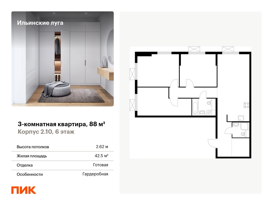 Продаётся 3-комн.квартира площадью 88.00 кв.м на 6 этаже 9 этажного дома (Корпус 2.10, секция 3) проекта ПИК Ильинские луга. Светлый просторный подъезд на уровне земли, функциональная планировка, большие окна, с отделкой. <br> <br>Жилой район «Ильинские луга» находится в 10 километрах от МКАД по Новорижскому шоссе, в 20 минутах на автомобиле от станций метро «Волоколамская», «Тушинская» и «Строгино». В будущем ближе к проекту, в 9 минутах пути на машине, откроется станция «Ильинская» Рублёво-Архангельской линии, которая будет соединять Арбатско-Покровскую линию и Большую кольцевую линию. <br> <br>«Ильинские луга» — масштабный проект, в который входит девять детских садов, четыре школы и поликлиника. Он строится в престижном и экологичном районе среди лесов и памятников природы. За 5 минут от жилого квартала можно доехать до Рублёво-Успенского шоссе, а за 30 минут — до центра Москвы. До крупного торгового центра «РИГАМОЛЛ» всего 5 минут на автомобиле, а до ТЦ «Твой дом» и гипермаркета «Глобус» — 10 минут. <br> <br>В «Ильинских лугах» строятся только девятиэтажные дома — такая архитектура соответствует спокойной жизни за городом. В каждом дворе-парке есть места для отдыха, детские и спортивные площадки. А ещё, здесь уже открыт большой PlayHub «Гравити» — современное игровое пространство с космической тематикой, холмами, зонами для игр и отдыха жителей любого возраста. <br> <br>На первых этажах уже работают магазины, кафе и пекарни. <br> <br>Места для отдыха от «Ильинских лугов» тоже недалеко: 10 минут на машине — и вы в музее-усадьбе «Архангельское». Также рядом находится Лохин остров — памятник природы, где водятся речные черепахи, есть места для кемпинга и возможность сплавиться по реке. Артикул - 912137О застройщике