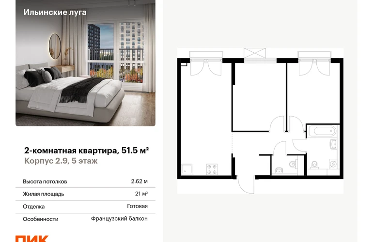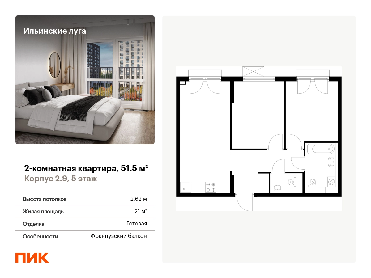 Продаётся 2-комн.квартира площадью 51.50 кв.м на 5 этаже 9 этажного дома (Корпус 2.9, секция 2) проекта ПИК Ильинские луга. Светлый просторный подъезд на уровне земли, функциональная планировка, большие окна, с отделкой. <br> <br>Жилой район «Ильинские луга» находится в 10 километрах от МКАД по Новорижскому шоссе, в 20 минутах на автомобиле от станций метро «Волоколамская», «Тушинская» и «Строгино». В будущем ближе к проекту, в 9 минутах пути на машине, откроется станция «Ильинская» Рублёво-Архангельской линии, которая будет соединять Арбатско-Покровскую линию и Большую кольцевую линию. <br> <br>«Ильинские луга» — масштабный проект, в который входит девять детских садов, четыре школы и поликлиника. Он строится в престижном и экологичном районе среди лесов и памятников природы. За 5 минут от жилого квартала можно доехать до Рублёво-Успенского шоссе, а за 30 минут — до центра Москвы. До крупного торгового центра «РИГАМОЛЛ» всего 5 минут на автомобиле, а до ТЦ «Твой дом» и гипермаркета «Глобус» — 10 минут. <br> <br>В «Ильинских лугах» строятся только девятиэтажные дома — такая архитектура соответствует спокойной жизни за городом. В каждом дворе-парке есть места для отдыха, детские и спортивные площадки. А ещё, здесь уже открыт большой PlayHub «Гравити» — современное игровое пространство с космической тематикой, холмами, зонами для игр и отдыха жителей любого возраста. <br> <br>На первых этажах уже работают магазины, кафе и пекарни. <br> <br>Места для отдыха от «Ильинских лугов» тоже недалеко: 10 минут на машине — и вы в музее-усадьбе «Архангельское». Также рядом находится Лохин остров — памятник природы, где водятся речные черепахи, есть места для кемпинга и возможность сплавиться по реке. Артикул - 933667О застройщике