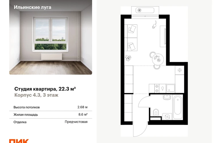 Продаётся квартира-студия площадью 22.30 кв.м на 3 этаже 9 этажного дома (Корпус 4.3, секция 2) проекта ПИК Ильинские луга. Светлый просторный подъезд на уровне земли, функциональная планировка, большие окна, с отделкой. <br> <br>Жилой район «Ильинские луга» находится в 10 километрах от МКАД по Новорижскому шоссе, в 20 минутах на автомобиле от станций метро «Волоколамская», «Тушинская» и «Строгино». В будущем ближе к проекту, в 9 минутах пути на машине, откроется станция «Ильинская» Рублёво-Архангельской линии, которая будет соединять Арбатско-Покровскую линию и Большую кольцевую линию. <br> <br>«Ильинские луга» — масштабный проект, в который входит девять детских садов, четыре школы и поликлиника. Он строится в престижном и экологичном районе среди лесов и памятников природы. За 5 минут от жилого квартала можно доехать до Рублёво-Успенского шоссе, а за 30 минут — до центра Москвы. До крупного торгового центра «РИГАМОЛЛ» всего 5 минут на автомобиле, а до ТЦ «Твой дом» и гипермаркета «Глобус» — 10 минут. <br> <br>В «Ильинских лугах» строятся только девятиэтажные дома — такая архитектура соответствует спокойной жизни за городом. В каждом дворе-парке есть места для отдыха, детские и спортивные площадки. А ещё, здесь уже открыт большой PlayHub «Гравити» — современное игровое пространство с космической тематикой, холмами, зонами для игр и отдыха жителей любого возраста. <br> <br>На первых этажах уже работают магазины, кафе и пекарни. <br> <br>Места для отдыха от «Ильинских лугов» тоже недалеко: 10 минут на машине — и вы в музее-усадьбе «Архангельское». Также рядом находится Лохин остров — памятник природы, где водятся речные черепахи, есть места для кемпинга и возможность сплавиться по реке. Артикул - 1011887О застройщике