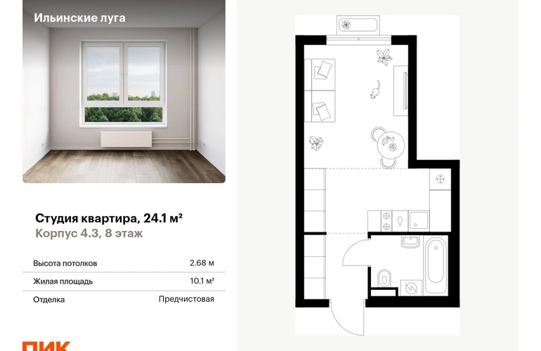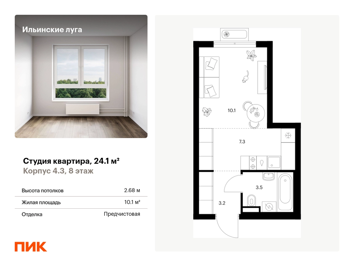 Продаётся квартира-студия площадью 24.10 кв.м на 8 этаже 9 этажного дома (Корпус 4.3, секция 1) проекта ПИК Ильинские луга. Светлый просторный подъезд на уровне земли, функциональная планировка, большие окна, с отделкой. Артикул - 1011840О застройщике
