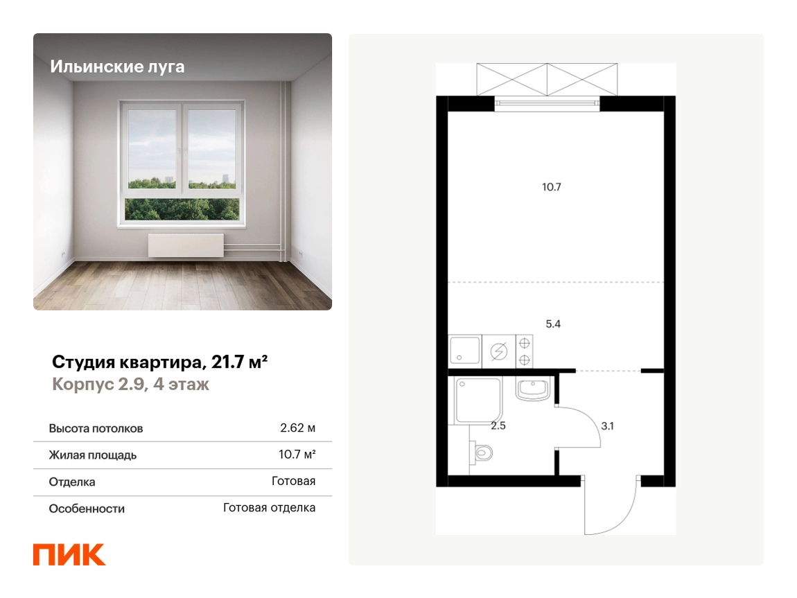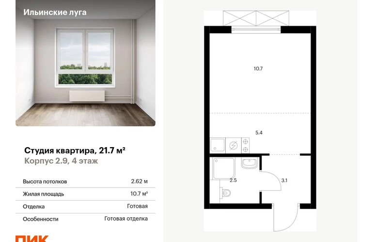 Продаётся квартира-студия площадью 21.70 кв.м на 4 этаже 9 этажного дома (Корпус 2.9, секция 4) проекта ПИК Ильинские луга. Светлый просторный подъезд на уровне земли, функциональная планировка, большие окна, с отделкой. <br> <br>Жилой район «Ильинские луга» находится в 10 километрах от МКАД по Новорижскому шоссе, в 20 минутах на автомобиле от станций метро «Волоколамская», «Тушинская» и «Строгино». В будущем ближе к проекту, в 9 минутах пути на машине, откроется станция «Ильинская» Рублёво-Архангельской линии, которая будет соединять Арбатско-Покровскую линию и Большую кольцевую линию. <br> <br>«Ильинские луга» — масштабный проект, в который входит девять детских садов, четыре школы и поликлиника. Он строится в престижном и экологичном районе среди лесов и памятников природы. За 5 минут от жилого квартала можно доехать до Рублёво-Успенского шоссе, а за 30 минут — до центра Москвы. До крупного торгового центра «РИГАМОЛЛ» всего 5 минут на автомобиле, а до ТЦ «Твой дом» и гипермаркета «Глобус» — 10 минут. <br> <br>В «Ильинских лугах» строятся только девятиэтажные дома — такая архитектура соответствует спокойной жизни за городом. В каждом дворе-парке есть места для отдыха, детские и спортивные площадки. А ещё, здесь уже открыт большой PlayHub «Гравити» — современное игровое пространство с космической тематикой, холмами, зонами для игр и отдыха жителей любого возраста. <br> <br>На первых этажах уже работают магазины, кафе и пекарни. <br> <br>Места для отдыха от «Ильинских лугов» тоже недалеко: 10 минут на машине — и вы в музее-усадьбе «Архангельское». Также рядом находится Лохин остров — памятник природы, где водятся речные черепахи, есть места для кемпинга и возможность сплавиться по реке. Артикул - 933993О застройщике