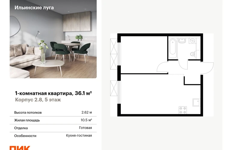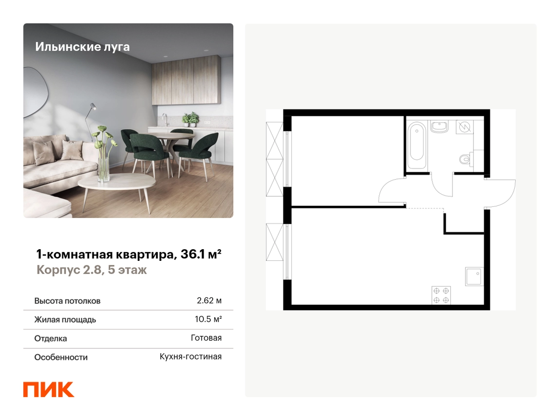 Продаётся 1-комн.квартира площадью 36.10 кв.м на 5 этаже 9 этажного дома (Корпус 2.8, секция 4) проекта ПИК Ильинские луга. Светлый просторный подъезд на уровне земли, функциональная планировка, большие окна, с отделкой. <br> <br>Жилой район «Ильинские луга» находится в 10 километрах от МКАД по Новорижскому шоссе, в 20 минутах на автомобиле от станций метро «Волоколамская», «Тушинская» и «Строгино». В будущем ближе к проекту, в 9 минутах пути на машине, откроется станция «Ильинская» Рублёво-Архангельской линии, которая будет соединять Арбатско-Покровскую линию и Большую кольцевую линию. <br> <br>«Ильинские луга» — масштабный проект, в который входит девять детских садов, четыре школы и поликлиника. Он строится в престижном и экологичном районе среди лесов и памятников природы. За 5 минут от жилого квартала можно доехать до Рублёво-Успенского шоссе, а за 30 минут — до центра Москвы. До крупного торгового центра «РИГАМОЛЛ» всего 5 минут на автомобиле, а до ТЦ «Твой дом» и гипермаркета «Глобус» — 10 минут. <br> <br>В «Ильинских лугах» строятся только девятиэтажные дома — такая архитектура соответствует спокойной жизни за городом. В каждом дворе-парке есть места для отдыха, детские и спортивные площадки. А ещё, здесь уже открыт большой PlayHub «Гравити» — современное игровое пространство с космической тематикой, холмами, зонами для игр и отдыха жителей любого возраста. <br> <br>На первых этажах уже работают магазины, кафе и пекарни. <br> <br>Места для отдыха от «Ильинских лугов» тоже недалеко: 10 минут на машине — и вы в музее-усадьбе «Архангельское». Также рядом находится Лохин остров — памятник природы, где водятся речные черепахи, есть места для кемпинга и возможность сплавиться по реке. Артикул - 942829О застройщике