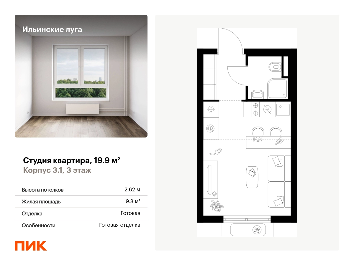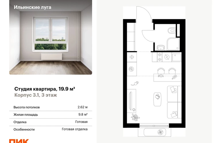 Продаётся квартира-студия площадью 19.90 кв.м на 3 этаже 9 этажного дома (Корпус 3.1, секция 2) проекта ПИК Ильинские луга. Светлый просторный подъезд на уровне земли, функциональная планировка, большие окна, с отделкой. Жилой район «Ильинские луга» находится в 10 километрах от МКАД по Новорижскому шоссе, в 20 минутах на автомобиле от станций метро «Волоколамская», «Тушинская» и «Строгино». В будущем ближе к проекту, в 9 минутах пути на машине, откроется станция «Ильинская» Рублёво-Архангельской линии, которая будет соединять Арбатско-Покровскую линию и Большую кольцевую линию. «Ильинские луга» — масштабный проект, в который входит девять детских садов, четыре школы и поликлиника. Он строится в престижном и экологичном районе среди лесов и памятников природы. За 5 минут от жилого квартала можно доехать до Рублёво-Успенского шоссе, а за 30 минут — до центра Москвы. До крупного торгового центра «РИГАМОЛЛ» всего 5 минут на автомобиле, а до ТЦ «Твой дом» и гипермаркета «Глобус» — 10 минут. В «Ильинских лугах» строятся только девятиэтажные дома — такая архитектура соответствует спокойной жизни за городом. В каждом дворе-парке есть места для отдыха, детские и спортивные площадки. А ещё, здесь уже открыт большой PlayHub «Гравити» — современное игровое пространство с космической тематикой, холмами, зонами для игр и отдыха жителей любого возраста. На первых этажах уже работают магазины, кафе и пекарни. Места для отдыха от «Ильинских лугов» тоже недалеко: 10 минут на машине — и вы в музее-усадьбе «Архангельское». Также рядом находится Лохин остров — памятник природы, где водятся речные черепахи, есть места для кемпинга и возможность сплавиться по реке. Артикул - 1001426О застройщике