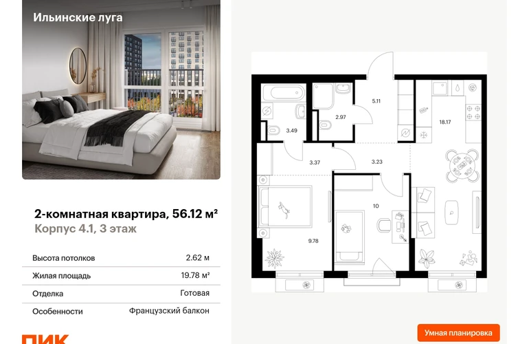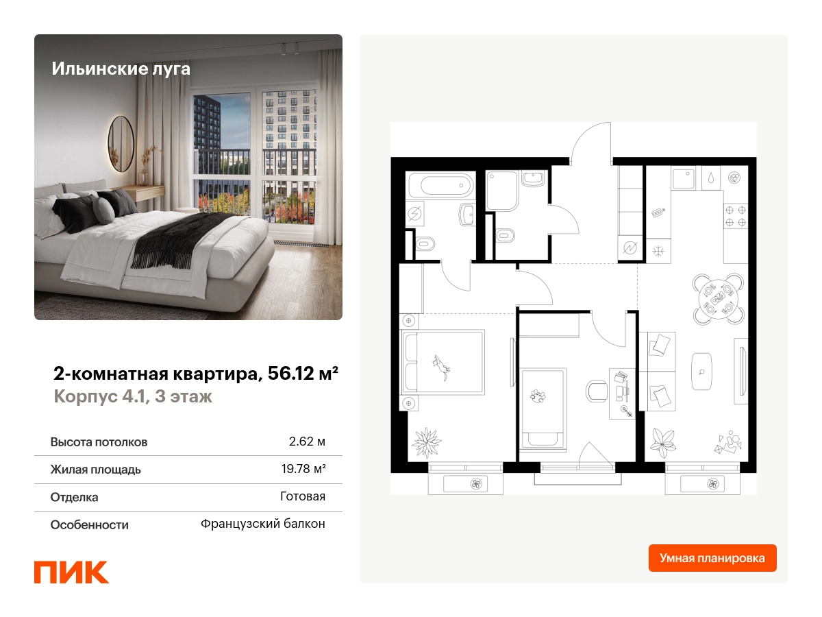 Продаётся 2-комн.квартира площадью 56.12 кв.м на 3 этаже 9 этажного дома (Корпус 4.1, секция 4) проекта ПИК Ильинские луга. Светлый просторный подъезд на уровне земли, функциональная планировка, большие окна, с отделкой. Жилой район «Ильинские луга» находится в 10 километрах от МКАД по Новорижскому шоссе, в 20 минутах на автомобиле от станций метро «Волоколамская», «Тушинская» и «Строгино». В будущем ближе к проекту, в 9 минутах пути на машине, откроется станция «Ильинская» Рублёво-Архангельской линии, которая будет соединять Арбатско-Покровскую линию и Большую кольцевую линию. «Ильинские луга» — масштабный проект, в который входит девять детских садов, четыре школы и поликлиника. Он строится в престижном и экологичном районе среди лесов и памятников природы. За 5 минут от жилого квартала можно доехать до Рублёво-Успенского шоссе, а за 30 минут — до центра Москвы. До крупного торгового центра «РИГАМОЛЛ» всего 5 минут на автомобиле, а до ТЦ «Твой дом» и гипермаркета «Глобус» — 10 минут. В «Ильинских лугах» строятся только девятиэтажные дома — такая архитектура соответствует спокойной жизни за городом. В каждом дворе-парке есть места для отдыха, детские и спортивные площадки. А ещё, здесь уже открыт большой PlayHub «Гравити» — современное игровое пространство с космической тематикой, холмами, зонами для игр и отдыха жителей любого возраста. На первых этажах уже работают магазины, кафе и пекарни. Места для отдыха от «Ильинских лугов» тоже недалеко: 10 минут на машине — и вы в музее-усадьбе «Архангельское». Также рядом находится Лохин остров — памятник природы, где водятся речные черепахи, есть места для кемпинга и возможность сплавиться по реке. Артикул - 1016046О застройщике
