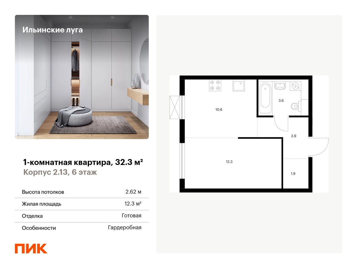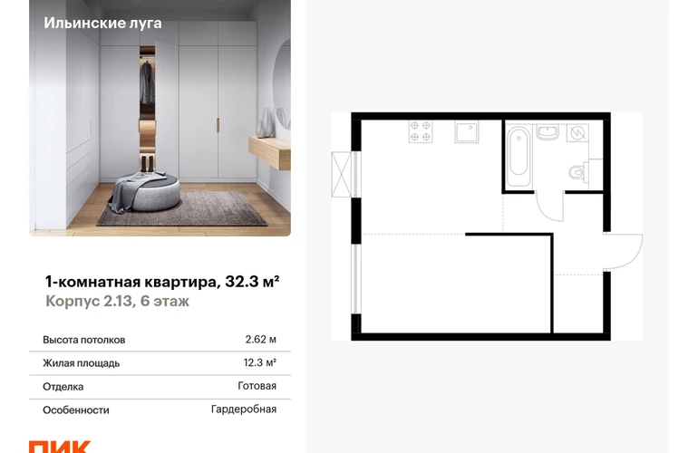 Продаётся 1-комн.квартира площадью 32.30 кв.м на 6 этаже 9 этажного дома (Корпус 2.13, секция 1) проекта ПИК Ильинские луга. Светлый просторный подъезд на уровне земли, функциональная планировка, большие окна, с отделкой. <br> <br>Жилой район «Ильинские луга» находится в 10 километрах от МКАД по Новорижскому шоссе, в 20 минутах на автомобиле от станций метро «Волоколамская», «Тушинская» и «Строгино». В будущем ближе к проекту, в 9 минутах пути на машине, откроется станция «Ильинская» Рублёво-Архангельской линии, которая будет соединять Арбатско-Покровскую линию и Большую кольцевую линию. <br> <br>«Ильинские луга» — масштабный проект, в который входит девять детских садов, четыре школы и поликлиника. Он строится в престижном и экологичном районе среди лесов и памятников природы. За 5 минут от жилого квартала можно доехать до Рублёво-Успенского шоссе, а за 30 минут — до центра Москвы. До крупного торгового центра «РИГАМОЛЛ» всего 5 минут на автомобиле, а до ТЦ «Твой дом» и гипермаркета «Глобус» — 10 минут. <br> <br>В «Ильинских лугах» строятся только девятиэтажные дома — такая архитектура соответствует спокойной жизни за городом. В каждом дворе-парке есть места для отдыха, детские и спортивные площадки. А ещё, здесь уже открыт большой PlayHub «Гравити» — современное игровое пространство с космической тематикой, холмами, зонами для игр и отдыха жителей любого возраста. <br> <br>На первых этажах уже работают магазины, кафе и пекарни. <br> <br>Места для отдыха от «Ильинских лугов» тоже недалеко: 10 минут на машине — и вы в музее-усадьбе «Архангельское». Также рядом находится Лохин остров — памятник природы, где водятся речные черепахи, есть места для кемпинга и возможность сплавиться по реке. Артикул - 927502О застройщике