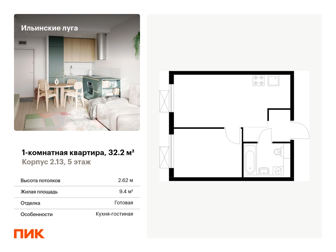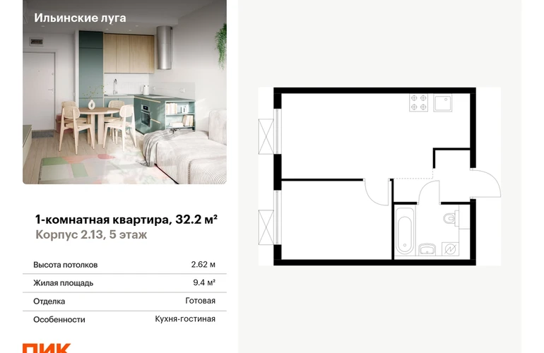 Продаётся 1-комн.квартира площадью 32.20 кв.м на 5 этаже 9 этажного дома (Корпус 2.13, секция 1) проекта ПИК Ильинские луга. Светлый просторный подъезд на уровне земли, функциональная планировка, большие окна, с отделкой. <br> <br>Жилой район «Ильинские луга» находится в 10 километрах от МКАД по Новорижскому шоссе, в 20 минутах на автомобиле от станций метро «Волоколамская», «Тушинская» и «Строгино». В будущем ближе к проекту, в 9 минутах пути на машине, откроется станция «Ильинская» Рублёво-Архангельской линии, которая будет соединять Арбатско-Покровскую линию и Большую кольцевую линию. <br> <br>«Ильинские луга» — масштабный проект, в который входит девять детских садов, четыре школы и поликлиника. Он строится в престижном и экологичном районе среди лесов и памятников природы. За 5 минут от жилого квартала можно доехать до Рублёво-Успенского шоссе, а за 30 минут — до центра Москвы. До крупного торгового центра «РИГАМОЛЛ» всего 5 минут на автомобиле, а до ТЦ «Твой дом» и гипермаркета «Глобус» — 10 минут. <br> <br>В «Ильинских лугах» строятся только девятиэтажные дома — такая архитектура соответствует спокойной жизни за городом. В каждом дворе-парке есть места для отдыха, детские и спортивные площадки. А ещё, здесь уже открыт большой PlayHub «Гравити» — современное игровое пространство с космической тематикой, холмами, зонами для игр и отдыха жителей любого возраста. <br> <br>На первых этажах уже работают магазины, кафе и пекарни. <br> <br>Места для отдыха от «Ильинских лугов» тоже недалеко: 10 минут на машине — и вы в музее-усадьбе «Архангельское». Также рядом находится Лохин остров — памятник природы, где водятся речные черепахи, есть места для кемпинга и возможность сплавиться по реке. Артикул - 927485О застройщике
