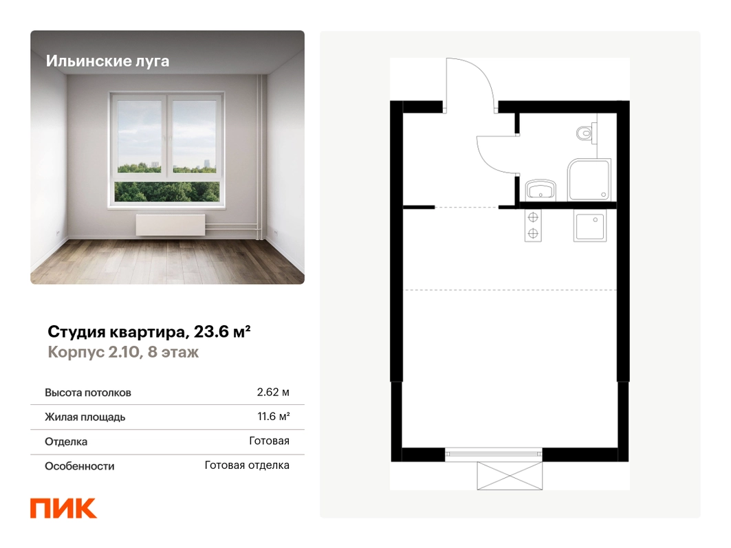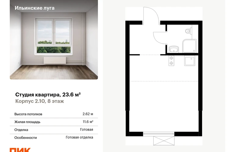 Продаётся квартира-студия площадью 23.60 кв.м на 8 этаже 9 этажного дома (Корпус 2.10, секция 1) проекта ПИК Ильинские луга. Светлый просторный подъезд на уровне земли, функциональная планировка, большие окна, с отделкой. <br> <br>Жилой район «Ильинские луга» находится в 10 километрах от МКАД по Новорижскому шоссе, в 20 минутах на автомобиле от станций метро «Волоколамская», «Тушинская» и «Строгино». В будущем ближе к проекту, в 9 минутах пути на машине, откроется станция «Ильинская» Рублёво-Архангельской линии, которая будет соединять Арбатско-Покровскую линию и Большую кольцевую линию. <br> <br>«Ильинские луга» — масштабный проект, в который входит девять детских садов, четыре школы и поликлиника. Он строится в престижном и экологичном районе среди лесов и памятников природы. За 5 минут от жилого квартала можно доехать до Рублёво-Успенского шоссе, а за 30 минут — до центра Москвы. До крупного торгового центра «РИГАМОЛЛ» всего 5 минут на автомобиле, а до ТЦ «Твой дом» и гипермаркета «Глобус» — 10 минут. <br> <br>В «Ильинских лугах» строятся только девятиэтажные дома — такая архитектура соответствует спокойной жизни за городом. В каждом дворе-парке есть места для отдыха, детские и спортивные площадки. А ещё, здесь уже открыт большой PlayHub «Гравити» — современное игровое пространство с космической тематикой, холмами, зонами для игр и отдыха жителей любого возраста. <br> <br>На первых этажах уже работают магазины, кафе и пекарни. <br> <br>Места для отдыха от «Ильинских лугов» тоже недалеко: 10 минут на машине — и вы в музее-усадьбе «Архангельское». Также рядом находится Лохин остров — памятник природы, где водятся речные черепахи, есть места для кемпинга и возможность сплавиться по реке. Артикул - 911950О застройщике