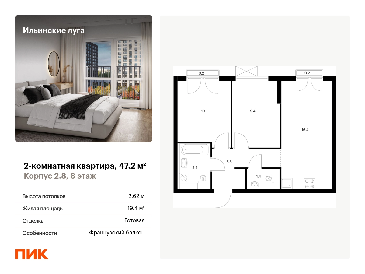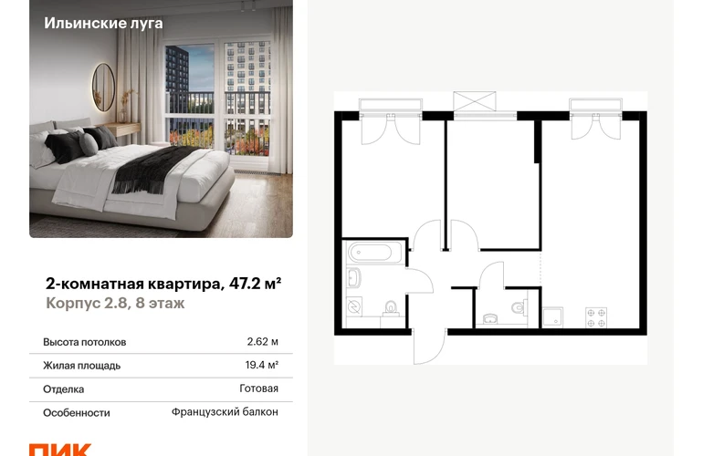 Продаётся 2-комн.квартира площадью 47.20 кв.м на 8 этаже 9 этажного дома (Корпус 2.8, секция 4) проекта ПИК Ильинские луга. Светлый просторный подъезд на уровне земли, функциональная планировка, большие окна, с отделкой. <br> <br>Жилой район «Ильинские луга» находится в 10 километрах от МКАД по Новорижскому шоссе, в 20 минутах на автомобиле от станций метро «Волоколамская», «Тушинская» и «Строгино». В будущем ближе к проекту, в 9 минутах пути на машине, откроется станция «Ильинская» Рублёво-Архангельской линии, которая будет соединять Арбатско-Покровскую линию и Большую кольцевую линию. <br> <br>«Ильинские луга» — масштабный проект, в который входит девять детских садов, четыре школы и поликлиника. Он строится в престижном и экологичном районе среди лесов и памятников природы. За 5 минут от жилого квартала можно доехать до Рублёво-Успенского шоссе, а за 30 минут — до центра Москвы. До крупного торгового центра «РИГАМОЛЛ» всего 5 минут на автомобиле, а до ТЦ «Твой дом» и гипермаркета «Глобус» — 10 минут. <br> <br>В «Ильинских лугах» строятся только девятиэтажные дома — такая архитектура соответствует спокойной жизни за городом. В каждом дворе-парке есть места для отдыха, детские и спортивные площадки. А ещё, здесь уже открыт большой PlayHub «Гравити» — современное игровое пространство с космической тематикой, холмами, зонами для игр и отдыха жителей любого возраста. <br> <br>На первых этажах уже работают магазины, кафе и пекарни. <br> <br>Места для отдыха от «Ильинских лугов» тоже недалеко: 10 минут на машине — и вы в музее-усадьбе «Архангельское». Также рядом находится Лохин остров — памятник природы, где водятся речные черепахи, есть места для кемпинга и возможность сплавиться по реке. Артикул - 942875О застройщике