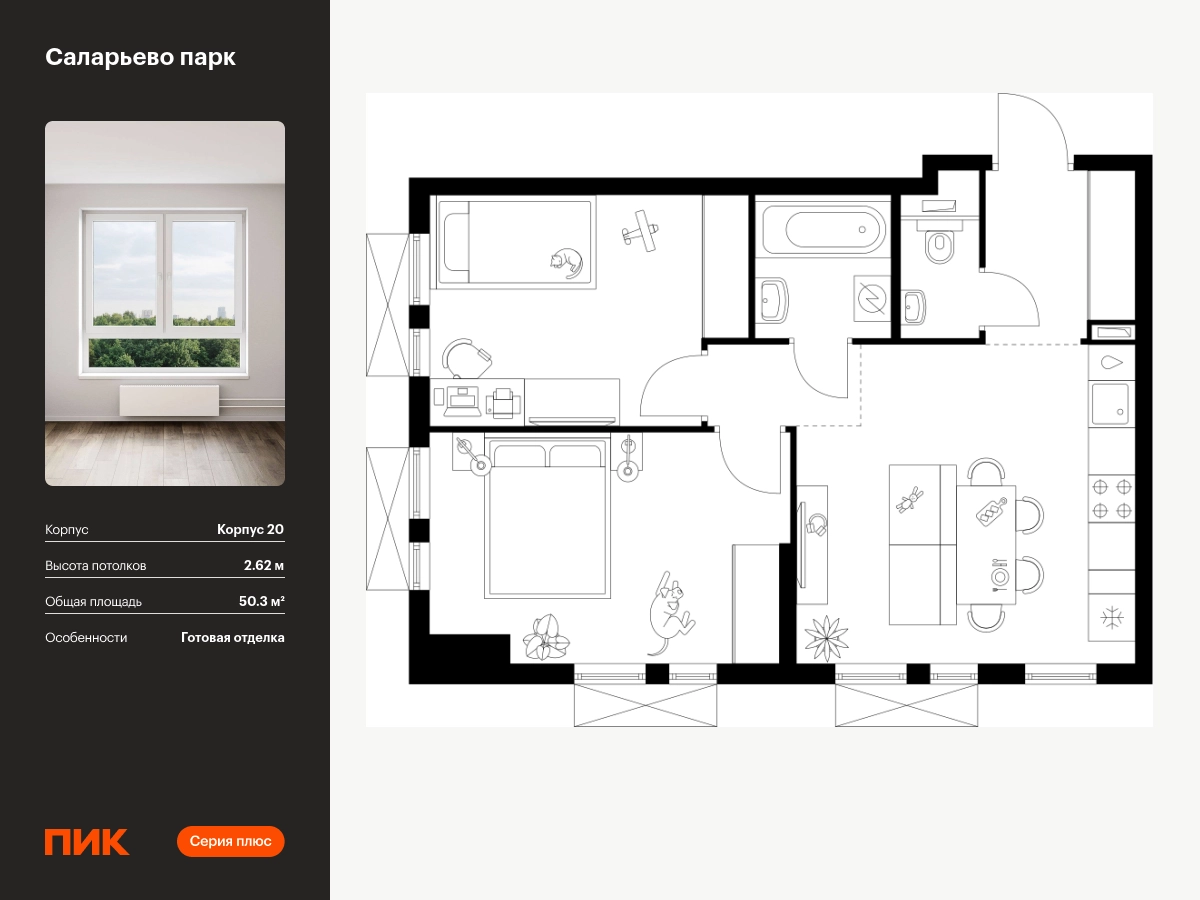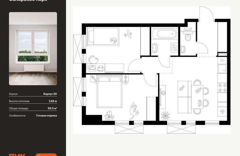 Продаётся 2-комн.квартира площадью 50.30 кв.м на 11 этаже 16 этажного дома (Корпус 20, секция 2) проекта ПИК Саларьево парк. Светлый просторный подъезд на уровне земли, функциональная планировка, большие окна, с отделкой. <br> <br>Жилой район «Саларьево парк» расположен в Новой Москве, в четырёх километрах от МКАД по Киевскому шоссе. Две станции метро: «Саларьево» и «Филатов луг» — находятся в пешей доступности от проекта. Дойти до них можно за 5–10 минут. В квартале уже создана качественная среда, где есть абсолютно всё для полноценной жизни, работы и отдыха. <br> <br>«Саларьево парк» — не просто квартал, а полноценный жилой район, который отличается разноплановой архитектурой. Над концепцией квартала работали несколько ведущих архитектурных бюро, которые стремились добиться разнообразия в фасадных решениях. Ярким примером такого подхода станет корпус 83, который относится к «Серии плюс». <br> <br>Новый корпус 83 был создан по принципам южной архитектуры: расслабленный и лаконичный силуэт зданий, привлекающий к себе внимание. Архитектурная изюминка 83-го корпуса — террасы и фигурные балконы. Вместе с окнами и другими акцентными элементами они создают уникальный облик здания, отсылая нас к изысканной южной архитектуре. <br> <br>Все корпуса в квартале гармонично сочетаются, образуя единую городскую среду. Здесь приятно гулять и проводить время на улице всей семьёй. <br> <br>В «Саларьево парке» создана уникальная образовательная среда, включающая в себя шесть школ, рассчитанных на 6 250 учеников. Две из них уже открыты, их посещает 2 300 детей. Также на территории «Саларьево парка» находится 12 детских садов, один из которых с бассейном. Сейчас уже открыты 7 садов. <br> <br>В «Саларьево парке» открыта уникальная игровая площадка — PlayHub «Оригами». Здесь есть ручей, горка-труба и рельефные холмы. Взрослые смогут отдохнуть в уютном кафе, пока дети играют. Также на территории проекта есть SportHub — большая спортивная зона, разделённая по интересам и возрастам. Здесь можно заниматься разными видами спорта: футболом, баскетболом, волейболом и стритболом. Зимой центральную часть площадки превращают в каток. <br> <br>Во дворах-парках жилого квартала есть места для отдыха, детские и спортивные площадки. На первых этажах домов расположены магазины, кафе и полезные сервисы. Также вблизи проекта есть несколько масштабных торговых центров. До ТЦ «Саларис» пять минут пешком, до «Рио», Metro Cash & Carry и «Лемана про» — пять минут на автомобиле. Артикул - 946939О застройщике
