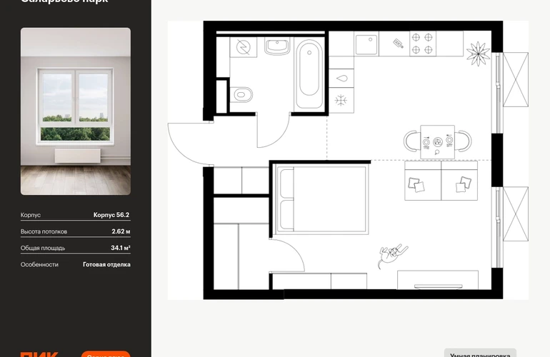 Продаётся 1-комн.квартира площадью 34.10 кв.м на 11 этаже 22 этажного дома (Корпус 56.2 , секция 1) проекта ПИК Саларьево парк. Светлый просторный подъезд на уровне земли, функциональная планировка, большие окна, с отделкой. <br> <br>Жилой район «Саларьево парк» расположен в Новой Москве, в четырёх километрах от МКАД по Киевскому шоссе. Две станции метро: «Саларьево» и «Филатов луг» — находятся в пешей доступности от проекта. Дойти до них можно за 5–10 минут. В квартале уже создана качественная среда, где есть абсолютно всё для полноценной жизни, работы и отдыха. <br> <br>«Саларьево парк» — не просто квартал, а полноценный жилой район, который отличается разноплановой архитектурой. Над концепцией квартала работали несколько ведущих архитектурных бюро, которые стремились добиться разнообразия в фасадных решениях. Ярким примером такого подхода станет корпус 83, который относится к «Серии плюс». <br> <br>Новый корпус 83 был создан по принципам южной архитектуры: расслабленный и лаконичный силуэт зданий, привлекающий к себе внимание. Архитектурная изюминка 83-го корпуса — террасы и фигурные балконы. Вместе с окнами и другими акцентными элементами они создают уникальный облик здания, отсылая нас к изысканной южной архитектуре. <br> <br>Все корпуса в квартале гармонично сочетаются, образуя единую городскую среду. Здесь приятно гулять и проводить время на улице всей семьёй. <br> <br>В «Саларьево парке» создана уникальная образовательная среда, включающая в себя шесть школ, рассчитанных на 6 250 учеников. Две из них уже открыты, их посещает 2 300 детей. Также на территории «Саларьево парка» находится 12 детских садов, один из которых с бассейном. Сейчас уже открыты 7 садов. <br> <br>В «Саларьево парке» открыта уникальная игровая площадка — PlayHub «Оригами». Здесь есть ручей, горка-труба и рельефные холмы. Взрослые смогут отдохнуть в уютном кафе, пока дети играют. Также на территории проекта есть SportHub — большая спортивная зона, разделённая по интересам и возрастам. Здесь можно заниматься разными видами спорта: футболом, баскетболом, волейболом и стритболом. Зимой центральную часть площадки превращают в каток. <br> <br>Во дворах-парках жилого квартала есть места для отдыха, детские и спортивные площадки. На первых этажах домов расположены магазины, кафе и полезные сервисы. Также вблизи проекта есть несколько масштабных торговых центров. До ТЦ «Саларис» пять минут пешком, до «Рио», Metro Cash & Carry и «Леруа Мерлен» — пять минут на автомобиле. Артикул - 990120О застройщике