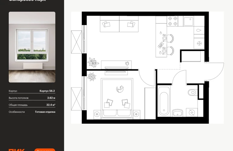 Продаётся 1-комн.квартира площадью 32.40 кв.м на 5 этаже 22 этажного дома (Корпус 56.2 , секция 1) проекта ПИК Саларьево парк. Светлый просторный подъезд на уровне земли, функциональная планировка, большие окна, с отделкой. <br> <br>Жилой район «Саларьево парк» расположен в Новой Москве, в четырёх километрах от МКАД по Киевскому шоссе. Две станции метро: «Саларьево» и «Филатов луг» — находятся в пешей доступности от проекта. Дойти до них можно за 5–10 минут. В квартале уже создана качественная среда, где есть абсолютно всё для полноценной жизни, работы и отдыха. <br> <br>«Саларьево парк» — не просто квартал, а полноценный жилой район, который отличается разноплановой архитектурой. Над концепцией квартала работали несколько ведущих архитектурных бюро, которые стремились добиться разнообразия в фасадных решениях. Ярким примером такого подхода станет корпус 83, который относится к «Серии плюс». <br> <br>Новый корпус 83 был создан по принципам южной архитектуры: расслабленный и лаконичный силуэт зданий, привлекающий к себе внимание. Архитектурная изюминка 83-го корпуса — террасы и фигурные балконы. Вместе с окнами и другими акцентными элементами они создают уникальный облик здания, отсылая нас к изысканной южной архитектуре. <br> <br>Все корпуса в квартале гармонично сочетаются, образуя единую городскую среду. Здесь приятно гулять и проводить время на улице всей семьёй. <br> <br>В «Саларьево парке» создана уникальная образовательная среда, включающая в себя шесть школ, рассчитанных на 6 250 учеников. Две из них уже открыты, их посещает 2 300 детей. Также на территории «Саларьево парка» находится 12 детских садов, один из которых с бассейном. Сейчас уже открыты 7 садов. <br> <br>В «Саларьево парке» открыта уникальная игровая площадка — PlayHub «Оригами». Здесь есть ручей, горка-труба и рельефные холмы. Взрослые смогут отдохнуть в уютном кафе, пока дети играют. Также на территории проекта есть SportHub — большая спортивная зона, разделённая по интересам и возрастам. Здесь можно заниматься разными видами спорта: футболом, баскетболом, волейболом и стритболом. Зимой центральную часть площадки превращают в каток. <br> <br>Во дворах-парках жилого квартала есть места для отдыха, детские и спортивные площадки. На первых этажах домов расположены магазины, кафе и полезные сервисы. Также вблизи проекта есть несколько масштабных торговых центров. До ТЦ «Саларис» пять минут пешком, до «Рио», Metro Cash & Carry и «Леруа Мерлен» — пять минут на автомобиле. Артикул - 990021О застройщике