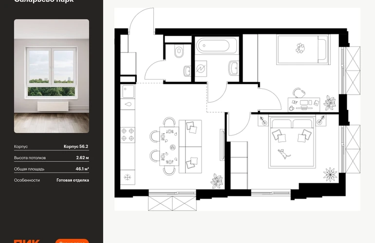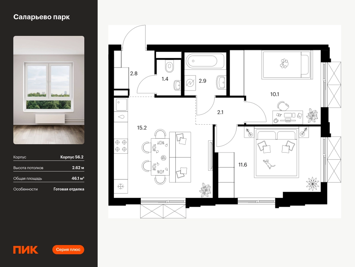 Продаётся 2-комн.квартира площадью 46.10 кв.м на 5 этаже 22 этажного дома (Корпус 56.2 , секция 2) проекта ПИК Саларьево парк. Светлый просторный подъезд на уровне земли, функциональная планировка, большие окна, с отделкой. <br> <br>Жилой район «Саларьево парк» расположен в Новой Москве, в четырёх километрах от МКАД по Киевскому шоссе. Две станции метро: «Саларьево» и «Филатов луг» — находятся в пешей доступности от проекта. Дойти до них можно за 5–10 минут. В квартале уже создана качественная среда, где есть абсолютно всё для полноценной жизни, работы и отдыха. <br> <br>«Саларьево парк» — не просто квартал, а полноценный жилой район, который отличается разноплановой архитектурой. Над концепцией квартала работали несколько ведущих архитектурных бюро, которые стремились добиться разнообразия в фасадных решениях. Ярким примером такого подхода станет корпус 83, который относится к «Серии плюс». <br> <br>Новый корпус 83 был создан по принципам южной архитектуры: расслабленный и лаконичный силуэт зданий, привлекающий к себе внимание. Архитектурная изюминка 83-го корпуса — террасы и фигурные балконы. Вместе с окнами и другими акцентными элементами они создают уникальный облик здания, отсылая нас к изысканной южной архитектуре. <br> <br>Все корпуса в квартале гармонично сочетаются, образуя единую городскую среду. Здесь приятно гулять и проводить время на улице всей семьёй. <br> <br>В «Саларьево парке» создана уникальная образовательная среда, включающая в себя шесть школ, рассчитанных на 6 250 учеников. Две из них уже открыты, их посещает 2 300 детей. Также на территории «Саларьево парка» находится 12 детских садов, один из которых с бассейном. Сейчас уже открыты 7 садов. <br> <br>В «Саларьево парке» открыта уникальная игровая площадка — PlayHub «Оригами». Здесь есть ручей, горка-труба и рельефные холмы. Взрослые смогут отдохнуть в уютном кафе, пока дети играют. Также на территории проекта есть SportHub — большая спортивная зона, разделённая по интересам и возрастам. Здесь можно заниматься разными видами спорта: футболом, баскетболом, волейболом и стритболом. Зимой центральную часть площадки превращают в каток. <br> <br>Во дворах-парках жилого квартала есть места для отдыха, детские и спортивные площадки. На первых этажах домов расположены магазины, кафе и полезные сервисы. Также вблизи проекта есть несколько масштабных торговых центров. До ТЦ «Саларис» пять минут пешком, до «Рио», Metro Cash & Carry и «Лемана про» — пять минут на автомобиле. Артикул - 990619О застройщике