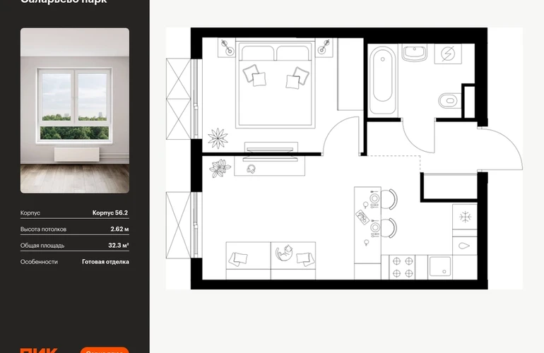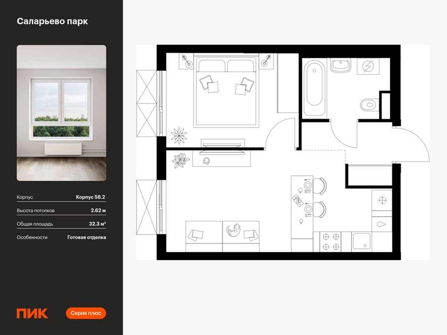 Продаётся 1-комн.квартира площадью 32.30 кв.м на 13 этаже 22 этажного дома (Корпус 56.2 , секция 1) проекта ПИК Саларьево парк. Светлый просторный подъезд на уровне земли, функциональная планировка, большие окна, с отделкой. <br> <br>Жилой район «Саларьево парк» расположен в Новой Москве, в четырёх километрах от МКАД по Киевскому шоссе. Две станции метро: «Саларьево» и «Филатов луг» — находятся в пешей доступности от проекта. Дойти до них можно за 5–10 минут. В квартале уже создана качественная среда, где есть абсолютно всё для полноценной жизни, работы и отдыха. <br> <br>«Саларьево парк» — не просто квартал, а полноценный жилой район, который отличается разноплановой архитектурой. Над концепцией квартала работали несколько ведущих архитектурных бюро, которые стремились добиться разнообразия в фасадных решениях. Ярким примером такого подхода станет корпус 83, который относится к «Серии плюс». <br> <br>Новый корпус 83 был создан по принципам южной архитектуры: расслабленный и лаконичный силуэт зданий, привлекающий к себе внимание. Архитектурная изюминка 83-го корпуса — террасы и фигурные балконы. Вместе с окнами и другими акцентными элементами они создают уникальный облик здания, отсылая нас к изысканной южной архитектуре. <br> <br>Все корпуса в квартале гармонично сочетаются, образуя единую городскую среду. Здесь приятно гулять и проводить время на улице всей семьёй. <br> <br>В «Саларьево парке» создана уникальная образовательная среда, включающая в себя шесть школ, рассчитанных на 6 250 учеников. Две из них уже открыты, их посещает 2 300 детей. Также на территории «Саларьево парка» находится 12 детских садов, один из которых с бассейном. Сейчас уже открыты 7 садов. <br> <br>В «Саларьево парке» открыта уникальная игровая площадка — PlayHub «Оригами». Здесь есть ручей, горка-труба и рельефные холмы. Взрослые смогут отдохнуть в уютном кафе, пока дети играют. Также на территории проекта есть SportHub — большая спортивная зона, разделённая по интересам и возрастам. Здесь можно заниматься разными видами спорта: футболом, баскетболом, волейболом и стритболом. Зимой центральную часть площадки превращают в каток. <br> <br>Во дворах-парках жилого квартала есть места для отдыха, детские и спортивные площадки. На первых этажах домов расположены магазины, кафе и полезные сервисы. Также вблизи проекта есть несколько масштабных торговых центров. До ТЦ «Саларис» пять минут пешком, до «Рио», Metro Cash & Carry и «Лемана про» — пять минут на автомобиле. Артикул - 990143О застройщике