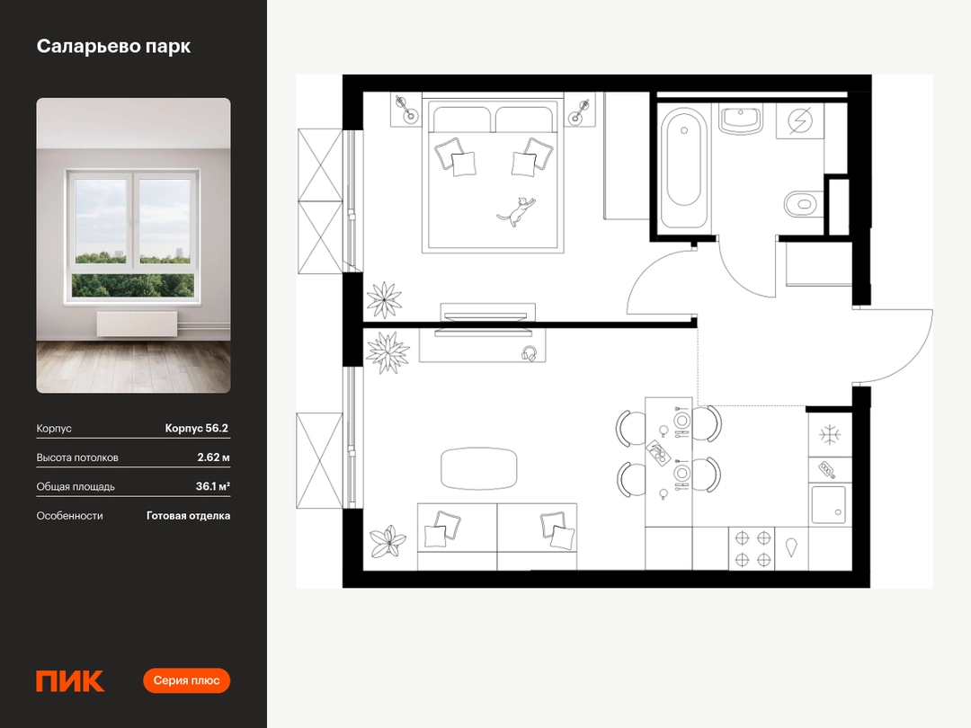 Продаётся 1-комн.квартира площадью 36.10 кв.м на 12 этаже 22 этажного дома (Корпус 56.2 , секция 3) проекта ПИК Саларьево парк. Светлый просторный подъезд на уровне земли, функциональная планировка, большие окна, с отделкой. <br> <br>Жилой район «Саларьево парк» расположен в Новой Москве, в четырёх километрах от МКАД по Киевскому шоссе. Две станции метро: «Саларьево» и «Филатов луг» — находятся в пешей доступности от проекта. Дойти до них можно за 5–10 минут. В квартале уже создана качественная среда, где есть абсолютно всё для полноценной жизни, работы и отдыха. <br> <br>«Саларьево парк» — не просто квартал, а полноценный жилой район, который отличается разноплановой архитектурой. Над концепцией квартала работали несколько ведущих архитектурных бюро, которые стремились добиться разнообразия в фасадных решениях. Ярким примером такого подхода станет корпус 83, который относится к «Серии плюс». <br> <br>Новый корпус 83 был создан по принципам южной архитектуры: расслабленный и лаконичный силуэт зданий, привлекающий к себе внимание. Архитектурная изюминка 83-го корпуса — террасы и фигурные балконы. Вместе с окнами и другими акцентными элементами они создают уникальный облик здания, отсылая нас к изысканной южной архитектуре. <br> <br>Все корпуса в квартале гармонично сочетаются, образуя единую городскую среду. Здесь приятно гулять и проводить время на улице всей семьёй. <br> <br>В «Саларьево парке» создана уникальная образовательная среда, включающая в себя шесть школ, рассчитанных на 6 250 учеников. Две из них уже открыты, их посещает 2 300 детей. Также на территории «Саларьево парка» находится 12 детских садов, один из которых с бассейном. Сейчас уже открыты 7 садов. <br> <br>В «Саларьево парке» открыта уникальная игровая площадка — PlayHub «Оригами». Здесь есть ручей, горка-труба и рельефные холмы. Взрослые смогут отдохнуть в уютном кафе, пока дети играют. Также на территории проекта есть SportHub — большая спортивная зона, разделённая по интересам и возрастам. Здесь можно заниматься разными видами спорта: футболом, баскетболом, волейболом и стритболом. Зимой центральную часть площадки превращают в каток. <br> <br>Во дворах-парках жилого квартала есть места для отдыха, детские и спортивные площадки. На первых этажах домов расположены магазины, кафе и полезные сервисы. Также вблизи проекта есть несколько масштабных торговых центров. До ТЦ «Саларис» пять минут пешком, до «Рио», Metro Cash & Carry и «Лемана про» — пять минут на автомобиле. Артикул - 990480О застройщике