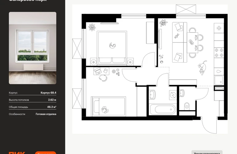 Продаётся 2-комн.квартира площадью 46.20 кв.м на 24 этаже 24 этажного дома (Корпус 68.4, секция 1) проекта ПИК Саларьево парк. Светлый просторный подъезд на уровне земли, функциональная планировка, большие окна, с отделкой. <br> <br>Жилой район «Саларьево парк» расположен в Новой Москве, в четырёх километрах от МКАД по Киевскому шоссе. Две станции метро: «Саларьево» и «Филатов луг» — находятся в пешей доступности от проекта. Дойти до них можно за 5–10 минут. В квартале уже создана качественная среда, где есть абсолютно всё для полноценной жизни, работы и отдыха. <br> <br>«Саларьево парк» — не просто квартал, а полноценный жилой район, который отличается разноплановой архитектурой. Над концепцией квартала работали несколько ведущих архитектурных бюро, которые стремились добиться разнообразия в фасадных решениях. Ярким примером такого подхода станет корпус 83, который относится к «Серии плюс». <br> <br>Новый корпус 83 был создан по принципам южной архитектуры: расслабленный и лаконичный силуэт зданий, привлекающий к себе внимание. Архитектурная изюминка 83-го корпуса — террасы и фигурные балконы. Вместе с окнами и другими акцентными элементами они создают уникальный облик здания, отсылая нас к изысканной южной архитектуре. <br> <br>Все корпуса в квартале гармонично сочетаются, образуя единую городскую среду. Здесь приятно гулять и проводить время на улице всей семьёй. <br> <br>В «Саларьево парке» создана уникальная образовательная среда, включающая в себя шесть школ, рассчитанных на 6 250 учеников. Две из них уже открыты, их посещает 2 300 детей. Также на территории «Саларьево парка» находится 12 детских садов, один из которых с бассейном. Сейчас уже открыты 7 садов. <br> <br>В «Саларьево парке» открыта уникальная игровая площадка — PlayHub «Оригами». Здесь есть ручей, горка-труба и рельефные холмы. Взрослые смогут отдохнуть в уютном кафе, пока дети играют. Также на территории проекта есть SportHub — большая спортивная зона, разделённая по интересам и возрастам. Здесь можно заниматься разными видами спорта: футболом, баскетболом, волейболом и стритболом. Зимой центральную часть площадки превращают в каток. <br> <br>Во дворах-парках жилого квартала есть места для отдыха, детские и спортивные площадки. На первых этажах домов расположены магазины, кафе и полезные сервисы. Также вблизи проекта есть несколько масштабных торговых центров. До ТЦ «Саларис» пять минут пешком, до «Рио», Metro Cash & Carry и «Лемана про» — пять минут на автомобиле. Артикул - 867858О застройщике
