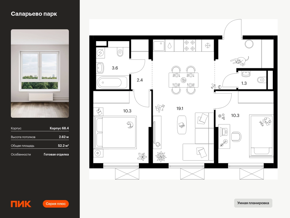 Продаётся 2-комн.квартира площадью 52.20 кв.м на 24 этаже 24 этажного дома (Корпус 68.4, секция 1) проекта ПИК Саларьево парк. Светлый просторный подъезд на уровне земли, функциональная планировка, большие окна, с отделкой. <br> <br>Жилой район «Саларьево парк» расположен в Новой Москве, в четырёх километрах от МКАД по Киевскому шоссе. Две станции метро: «Саларьево» и «Филатов луг» — находятся в пешей доступности от проекта. Дойти до них можно за 5–10 минут. В квартале уже создана качественная среда, где есть абсолютно всё для полноценной жизни, работы и отдыха. <br> <br>«Саларьево парк» — не просто квартал, а полноценный жилой район, который отличается разноплановой архитектурой. Над концепцией квартала работали несколько ведущих архитектурных бюро, которые стремились добиться разнообразия в фасадных решениях. Ярким примером такого подхода станет корпус 83, который относится к «Серии плюс». <br> <br>Новый корпус 83 был создан по принципам южной архитектуры: расслабленный и лаконичный силуэт зданий, привлекающий к себе внимание. Архитектурная изюминка 83-го корпуса — террасы и фигурные балконы. Вместе с окнами и другими акцентными элементами они создают уникальный облик здания, отсылая нас к изысканной южной архитектуре. <br> <br>Все корпуса в квартале гармонично сочетаются, образуя единую городскую среду. Здесь приятно гулять и проводить время на улице всей семьёй. <br> <br>В «Саларьево парке» создана уникальная образовательная среда, включающая в себя шесть школ, рассчитанных на 6 250 учеников. Две из них уже открыты, их посещает 2 300 детей. Также на территории «Саларьево парка» находится 12 детских садов, один из которых с бассейном. Сейчас уже открыты 7 садов. <br> <br>В «Саларьево парке» открыта уникальная игровая площадка — PlayHub «Оригами». Здесь есть ручей, горка-труба и рельефные холмы. Взрослые смогут отдохнуть в уютном кафе, пока дети играют. Также на территории проекта есть SportHub — большая спортивная зона, разделённая по интересам и возрастам. Здесь можно заниматься разными видами спорта: футболом, баскетболом, волейболом и стритболом. Зимой центральную часть площадки превращают в каток. <br> <br>Во дворах-парках жилого квартала есть места для отдыха, детские и спортивные площадки. На первых этажах домов расположены магазины, кафе и полезные сервисы. Также вблизи проекта есть несколько масштабных торговых центров. До ТЦ «Саларис» пять минут пешком, до «Рио», Metro Cash & Carry и «Лемана про» — пять минут на автомобиле. Артикул - 867823О застройщике